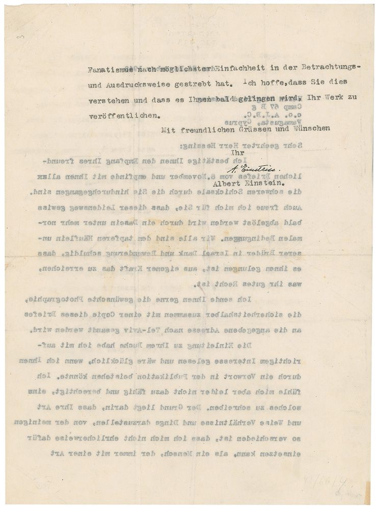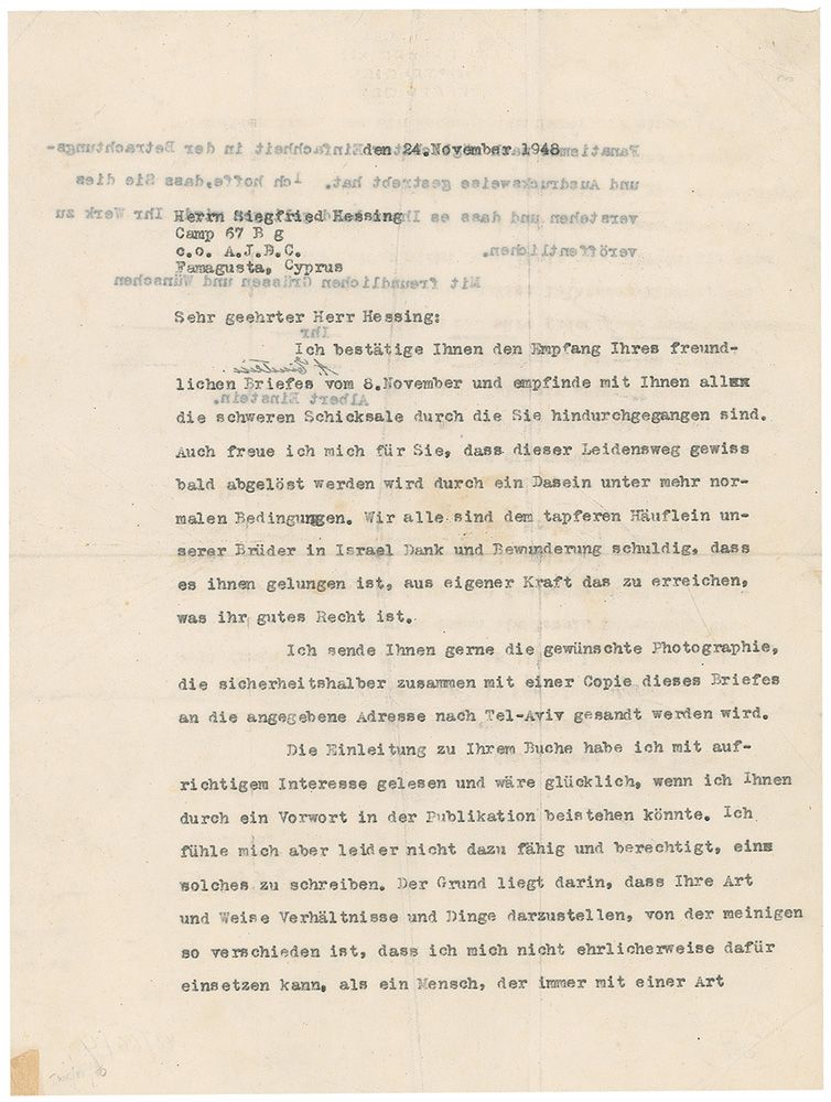 TLS in German, signed “A. Einstein,” one onionskin page both sides, 8.25 x 11, Princeton, November 24, 1948. Letter to Holocaust survivor Siegfried Hessing. In full (translated): “I am confirming the receipt of your friendly letter of November 8 and empathize with you for all the painful experiences which you have undergone. And I am happy for you that this episode of suffering will surely change soon into an existence under more normal conditions. We all owe the small heroic group of our brothers in Israel gratitude and admiration because they have achieved on their own that which is theirs by right. I will gladly send you the photograph you want, which will go, as a precaution, to the indicated address in Tel-Aviv, together with this letter. I have read the introduction to your book with true interest and would be happy if I could help you with a preface to its publication. Unfortunately I feel incapable and unqualified to do so. The reason is that your way to describe conditions and things is so different from my own that I cannot honestly support it—as a [human being] man who has always striven with a sort of fanaticism for the greatest possible simplicity in contemplation and way of expression. I hope that you understand this, and that you will soon be able to publish your work.” Intersecting folds, one through a single letter of signature, scattered creases and wrinkles, and tape remnant to one corner, otherwise fine condition.