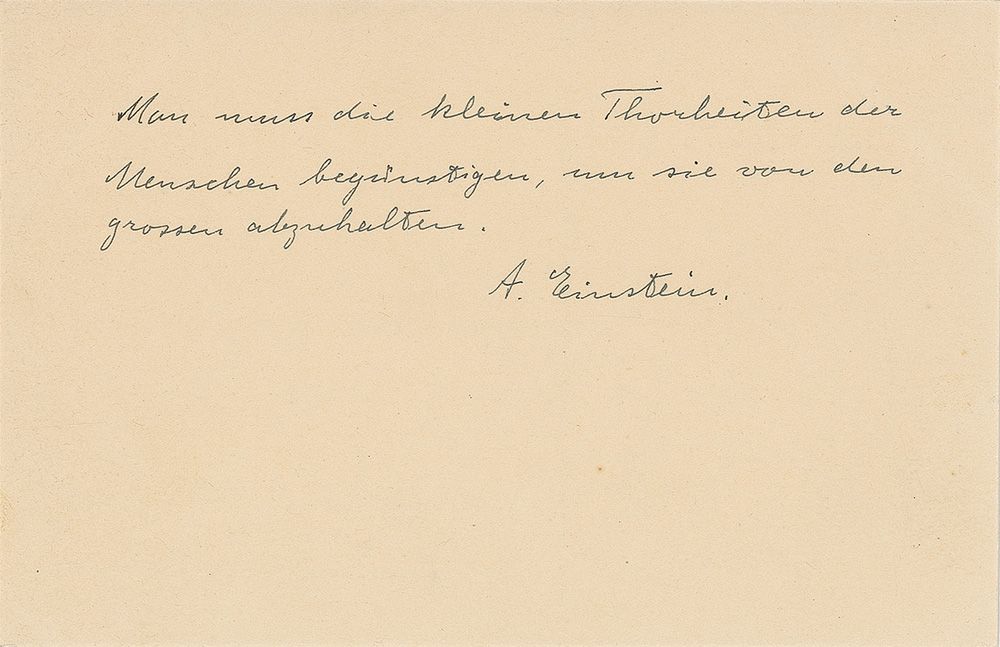 Superb AQS, in German, signed “A. Einstein,” on an off-white 5.5 x 3.5 postcard. Einstein writes (translated): “One must tolerate the small follies of mankind, in order to prevent the big ones.” In fine condition, with a few scattered creases. A poignant and meaningful statement in the context of Einstein’s life, as applicable today as it was when penned by revolutionary scientist.
