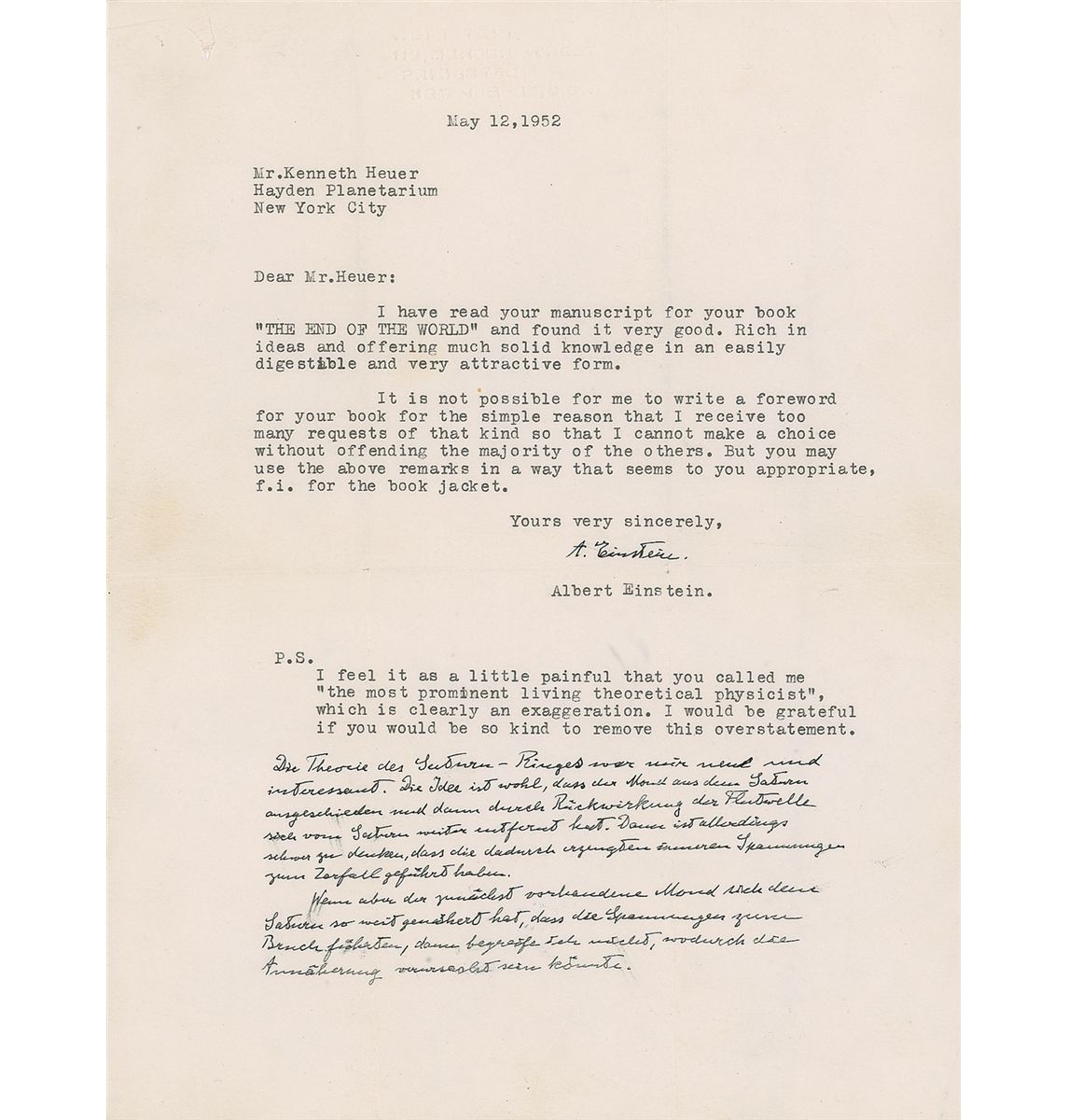 TLS signed “A. Einstein,” one page, 8.25 x 11, blind-stamped personal letterhead, May 12, 1952. Letter to physicist, astronomer, and author Kenneth Heuer at the Hayden Planetarium. In full: “I have read your manuscript for your book ‘THE END OF THE WORLD’