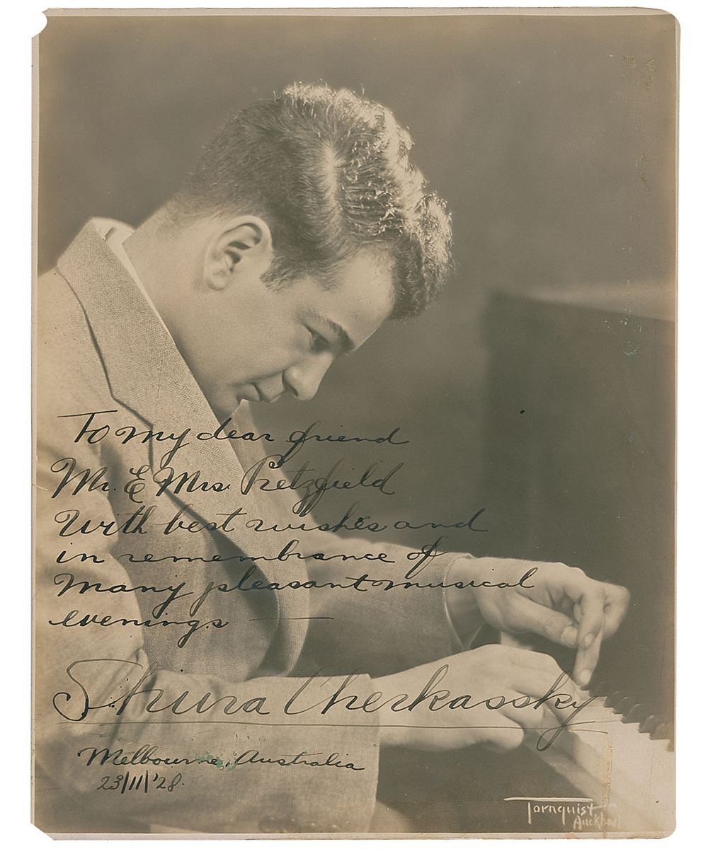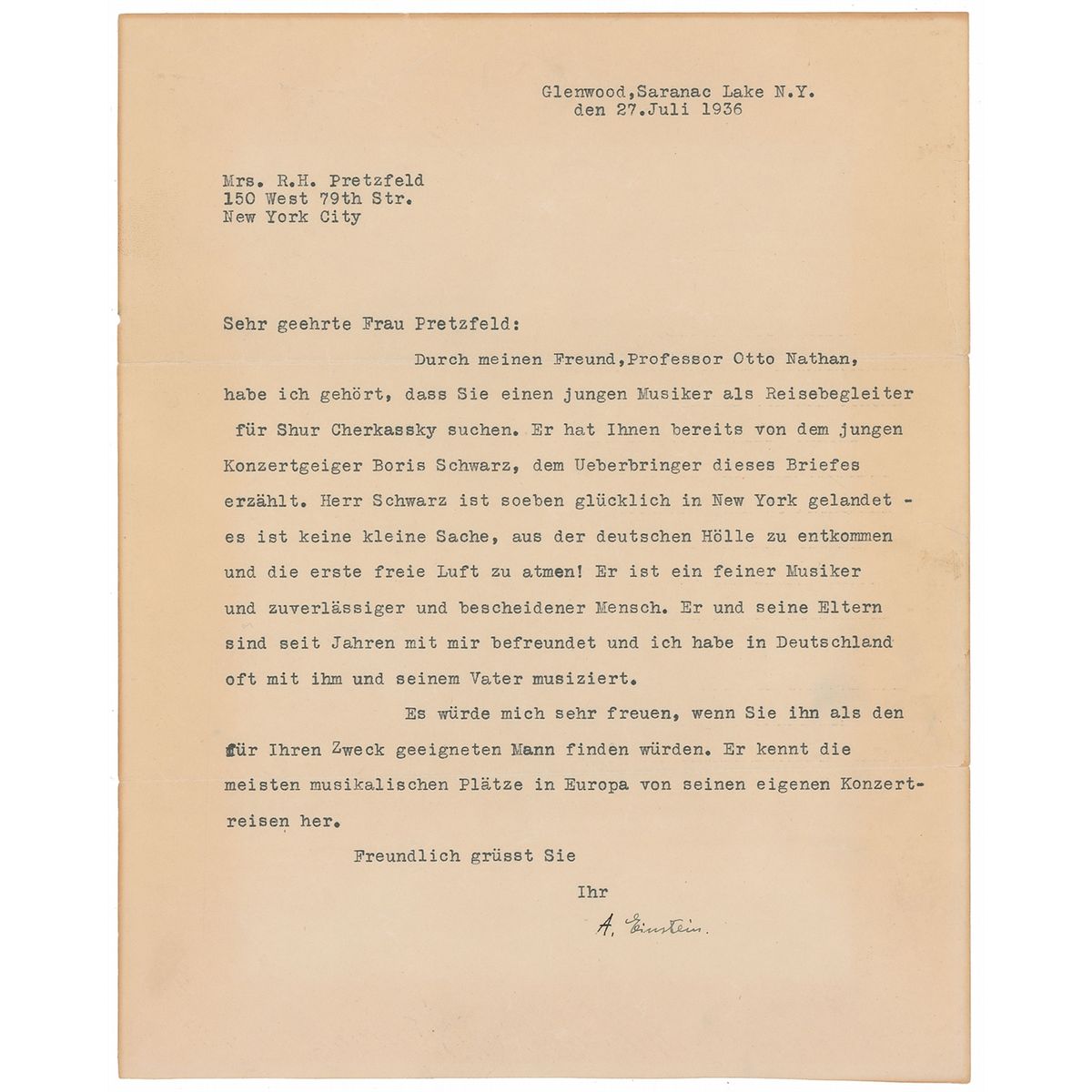 TLS in German, signed “A. Einstein,” one page, 8 x 10, Saranac Lake, N. Y., July 27, 1936. Letter to Mrs. R. H. Pretzfeld. In full (translated): “I have heard from my friend Professor Otto Nathan, that you are looking for a young musician to be Shur Cherkassky’s travel companion. He already told you about the young concert violinist Boris Schwarz, the man who brought you this letter. Mr. Schwarz is so happy to finally arrive in New York—this is not a little thing to escape from the German hell and be able to breathe the first free air! He and his parents are my good friends since many years. In Europe, I played music with him and his Father many times. I would be happy if you find him to be the man you are looking for. He knows most of the music places in Europe from his own concert music tours.” In very good condition, with uniform mild toning, a small tear to right edge, slight separation along one horizontal mailing fold, and scattered creases. Accompanied by a vintage matte-finish 7.5 x 9.5 photo of Cherkassky playing a piano, signed and inscribed in fountain pen, “To my dear friend Mr. & Mrs. Pretzfeld, with best wishes and in remembrance of many pleasant musical evenings, Shura Cherkassky, Melbourne, Australia, 23/11/28.”