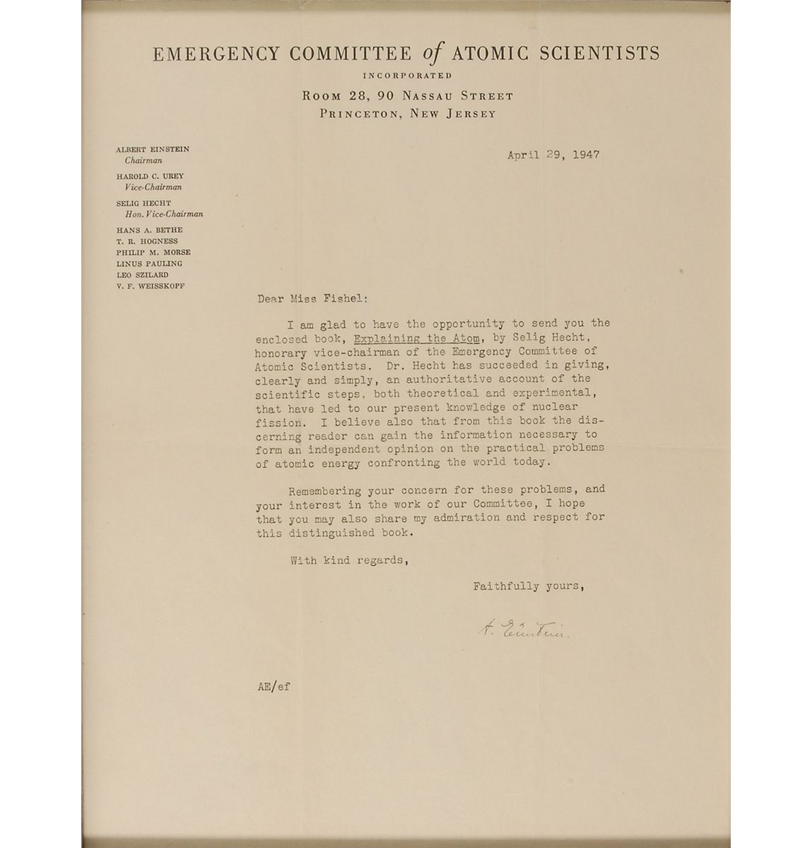 Einstein personally established the Emergency Committee of Atomic Scientists to warn the public of the dangers associated with the development of nuclear weapons, promote the peaceful use of nuclear energy, and ultimately work towards world peace. Among the committee members was Hecht, who wrote the “authoritative account of the scientific steps, both theoretical and experimental, that have lead to our present knowledge of nuclear fission” that Einstein here states he was sending. At the time, the book had only recently been published and offered the reader a clear explanation of the atom—unique in that Hecht was the only member of the esteemed committee who was not a nuclear physicist, but rather a biophysicist. The work is still regarded as being unsurpassed as an exposition of the history and the theory of the atom. Einstein clearly admired his colleague and his contributions to help encourage and further the peaceful uses of atomic energy.