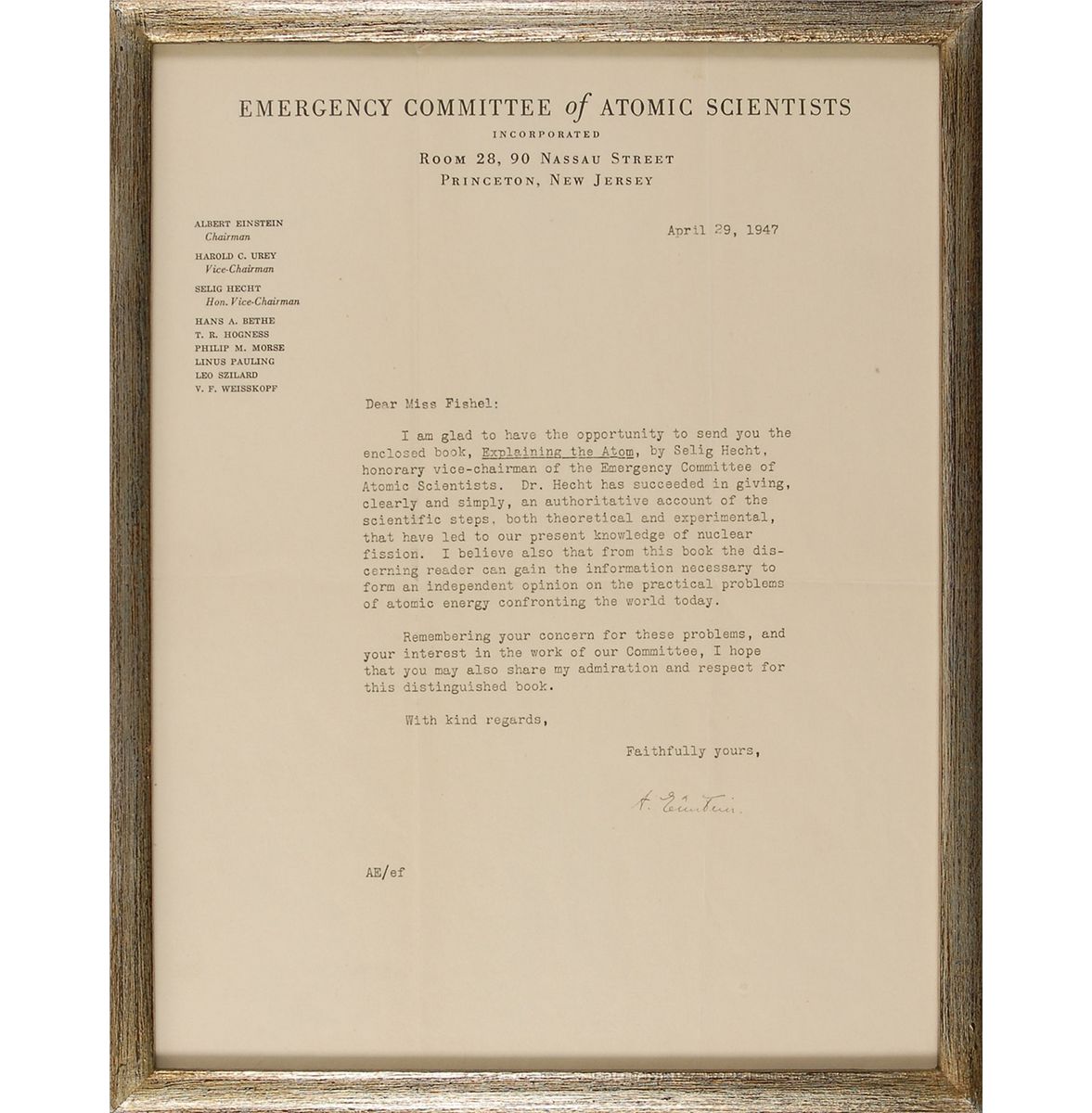 TLS signed “A. Einstein,” one page, 8.5 x 11, Emergency Committee of Atomic Scientists letterhead, April 29, 1947. Letter to Miss Fishel. In full: “I am glad to have the opportunity to send you the enclosed book, Explaining the Atom, by Selig Hecht, honorary vice-chairman of the Emergency Committee of Atomic Scientists. Dr. Hecht has succeeded in giving, clearly and simply, an authoritative account of the scientific steps, both theoretical and experimental, that have lead to our present knowledge of nuclear fission. I believe also that from this book the discerning reader can gain the information necessary to form an independent opinion on the practical problems of atomic energy confronting the world today. Remembering your concern for these problems, and your interest in the work of our Committee, I hope that you may also share my admiration and respect for this distinguished book.” Simply framed to an overall size of 9.25 x 11.75. In fine condition, with intersecting folds, one through a single letter of signature, and a bit of trivial soiling.