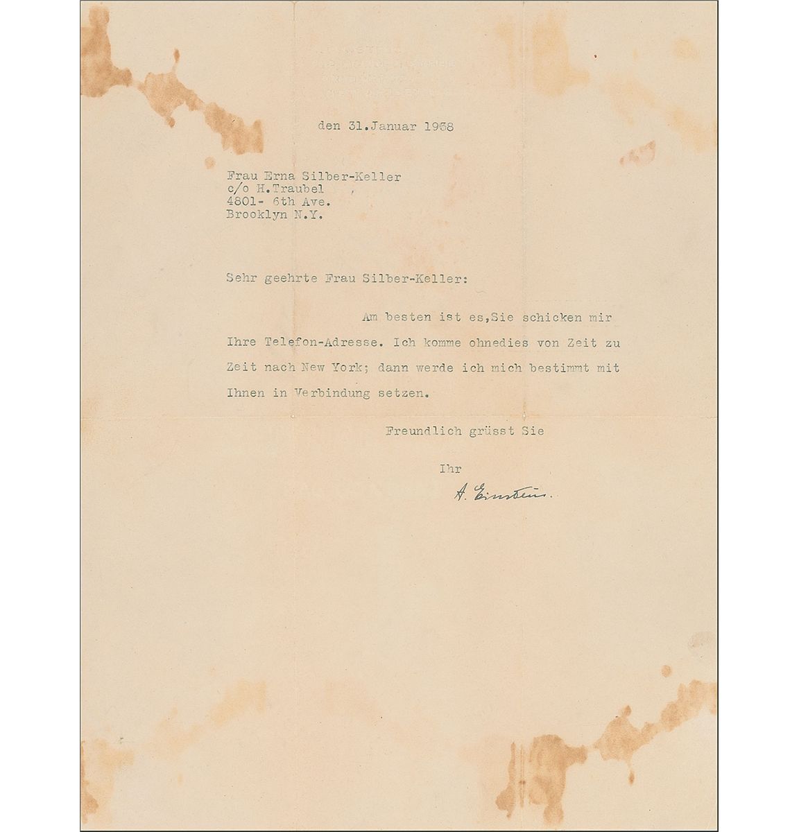 TLS in German, signed “A. Einstein,” 8.5 x 11, embossed personal letterhead, January 31, 1938. Einstein writes to Erna Silber-Keller of Brooklyn, New York, translated in full: “It would be best for you to send me your telephone address. From time to time I come to New York anyway; then I will definitely get in touch with you.” In very good condition, with intersecting folds, one passing through the end of the signature, uniform toning, a few scattered areas of staining, and a few trivial areas of separation along the folds.