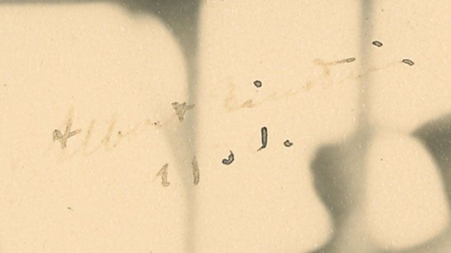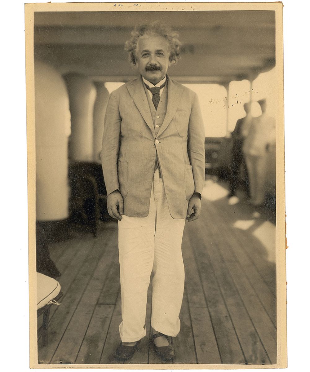 Vintage matte-finish 7 x 9.75 full-length photo of Einstein on the deck of the steamship Westernland in 1933 on his voyage to immigrate to the United States, signed in fountain pen, “Albert Einstein,” adding the date under his signature, and signed again along the top border. Stamped by Eastman Kodak in the lower border, this is, to our knowledge, an unpublished photo. Photo was originally framed and is accompanied by the original backing, which has several notes of provenance regarding the photo, with most of the notations partially faded as well. Notations state, “Albert Einstein, emmigrate [sic] to the U. S. 1933, photograph taken on ship by Charles Alfred Higgins, Jr., of Washington D. C. Autographed by Albert Einstein at Princeton, New Jersey. He settled in Princeton, N. J.” In very good condition, with only faint traces of both signatures visible due to ink fading and a thin mounting remnant along reverse top edge. As conditions in Germany deteriorated in 1933, Einstein decided to leave Europe once and for all, departing from Southhampton on October 7 with his wife Elsa, his secretary, and his assistant Dr. Walther Mayer. After arriving in New York, he eventually settled in Princeton, taking a position at the Institute for Advanced Study.