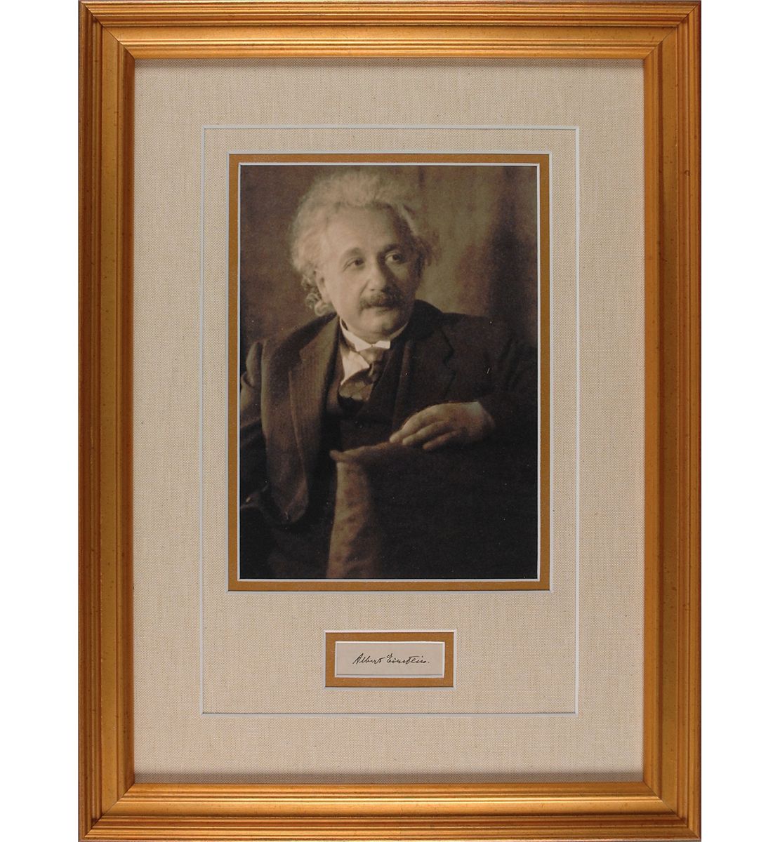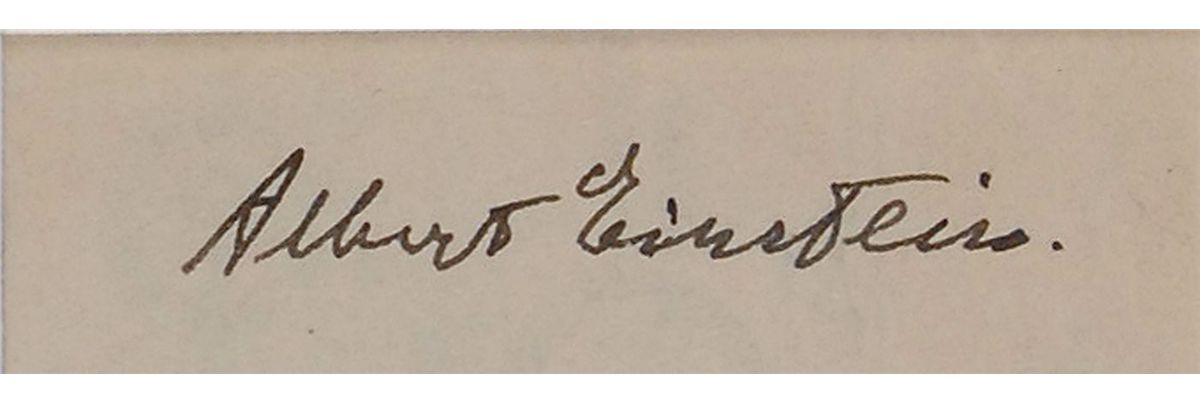 Crisp ink endorsement signature, “Albert Einstein,” on the reverse of a check matted down to 2.5 x .75. Check remains fully intact beneath, and was filled out and signed by Alice Falkenberg, payable to Einstein for $5.72, September 9, 1945. Gorgeously triple-cloth-matted and framed with portrait of the genius to an overall size of 14.5 x 19.5. In very fine condition.