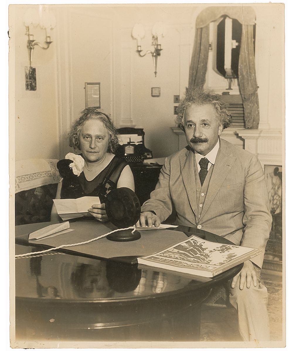Unsigned vintage glossy 8 x 9.25 photo of Einstein with his wife Elsa seated at a table. Light overall rippling, otherwise fine condition.