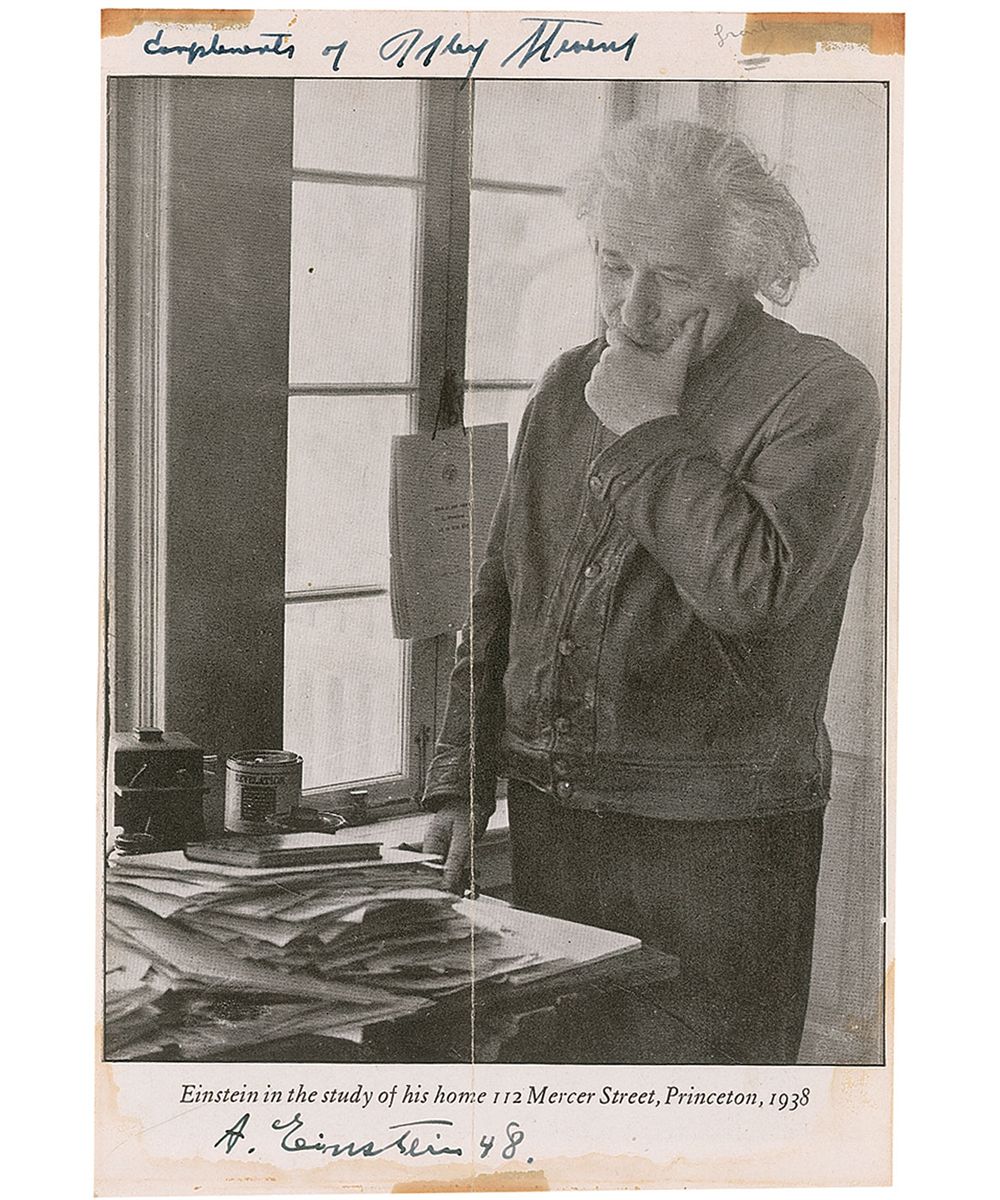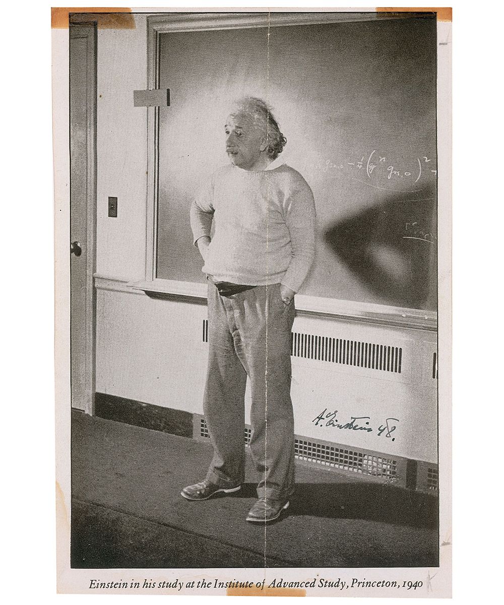 Vintage 5.25 x 7.5 double-sided book photo, one captioned, “Einstein in his study at the Institute of Advanced Study, Princeton, 1940,” which shows Einstein standing in front of a chalkboard with a mathematical equation on it, signed in fountain pen, “A. Einstein 48,” with the image on the reverse captioned, “Einstein in the study of his home 112 Mercer Street, Princeton, 1938,” which shows him looking pensively at a large pile of papers on his desk, also signed in fountain pen, “A. Einstein 48,” with a brief presentation written in the top border in an unknown hand. In fine condition, with a central vertical fold, and tape remnants and toning to horizontal edges which could be easily mostly matted out.