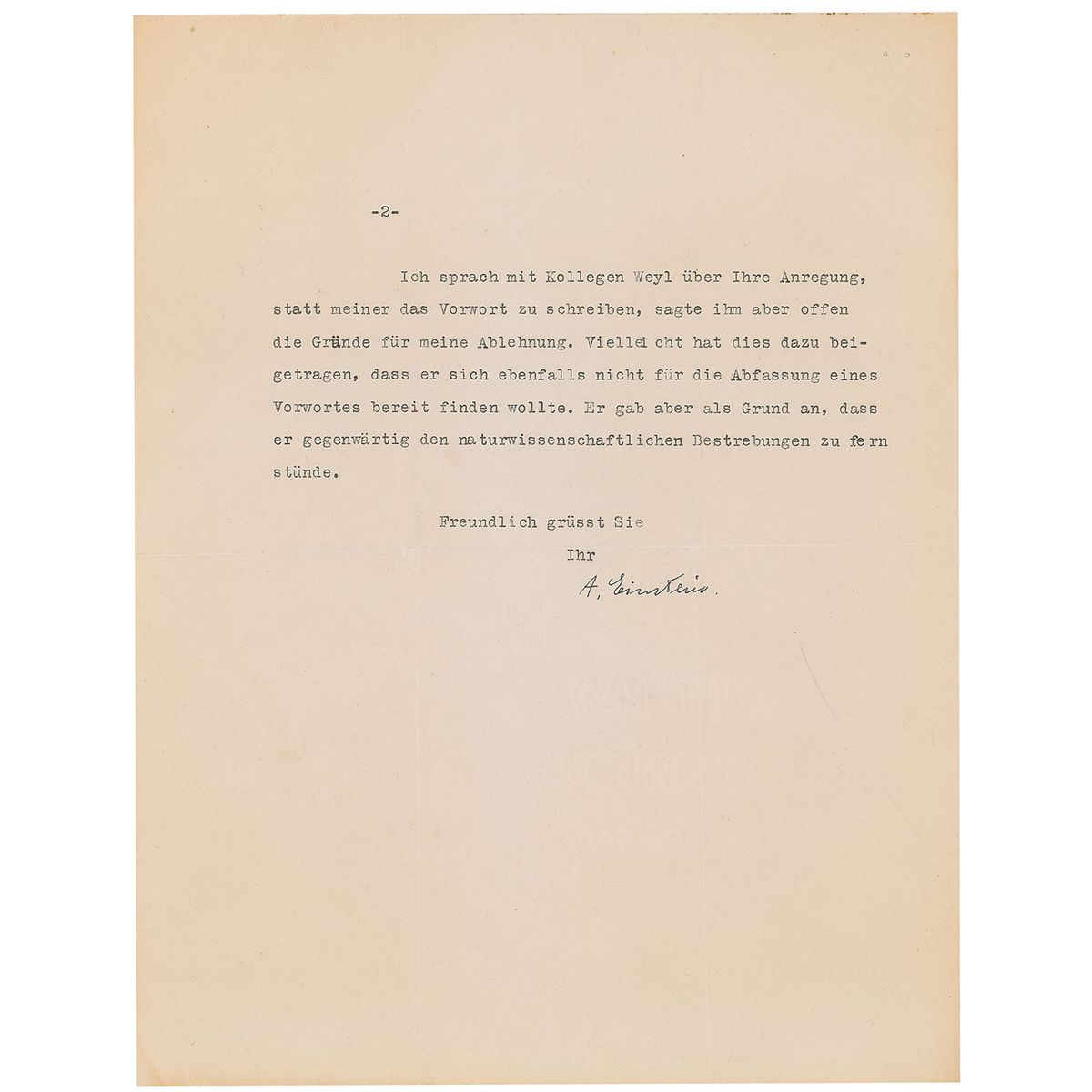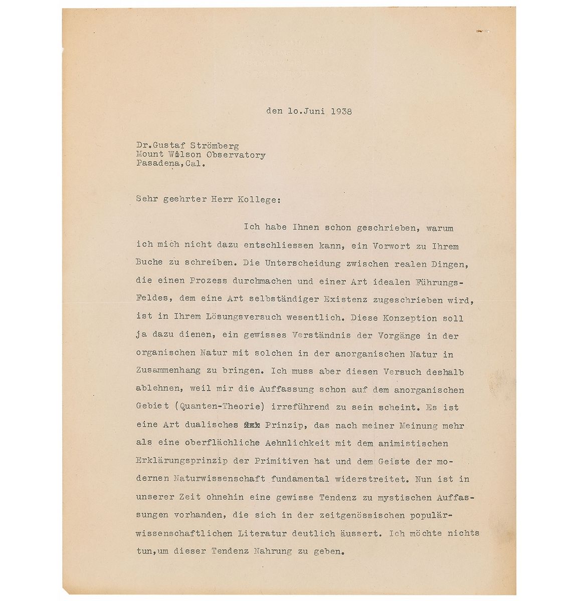 TLS in German, signed “A. Einstein,” two pages, 8.5 x 11, blind-stamped personal letterhead from his Princeton address, June 10, 1938. Letter to Dr. Gustaf Strömberg at the Mount Wilson Observatory in Pasadena, California. In full (translated): “I have already written and told you why I have resolved not to write a foreword to your book. The distinction between real things, which must undergo certain process of idealistic guidance, and to which certain independent existence is credited, is evident in your solution attempt. This concept must serve a certain understanding, which would balance the procedures within the organic and inorganic nature. I must reject this attempt because the opinion on the inorganic area (quantum-theory) seems to be misleading to me. It is a certain double-principle which, in my view, resembles much more than a superficial explanation of the primitive and is fundamentally opposed to modern science. However, there exists presently a certain tendency toward a mystical view, which is being publicized in the popular scientific literature. I do not want anything to feed this tendency. I spoke to my colleague Weyl about your suggestion that he write the foreword instead of me, and I also explained openly my reasons for the rejection. Perhaps this has contributed to his decision not to be available to compose the foreword. The reason he gave was that he presently was not fluent in scientific endeavors.” In fine condition, with intersecting folds, one through a single letter of signature, some light edge toning, and a staple hole to top right. Accompanied by six related items: an unsigned 10 x 8 photo of over 80 men in front of Cal Tech’s Norman Bridge Laboratory of Physics at the California Institute of Technology, with Einstein seated next to Dr. Robert Millikan in the first row; an invitation to the May 22, 1955, UCLA Memorial Meeting honoring Einstein’s memory; a program and a ticket admitting two to the UCLA Memorial Meeting; an 8 x 10 bust portrait of Dr. Gustaf Stromberg; and a booklet entitled Emergent Energy by Stromberg, reprinted from ‘The Journal of the Franklin Institute,’ May 1946.