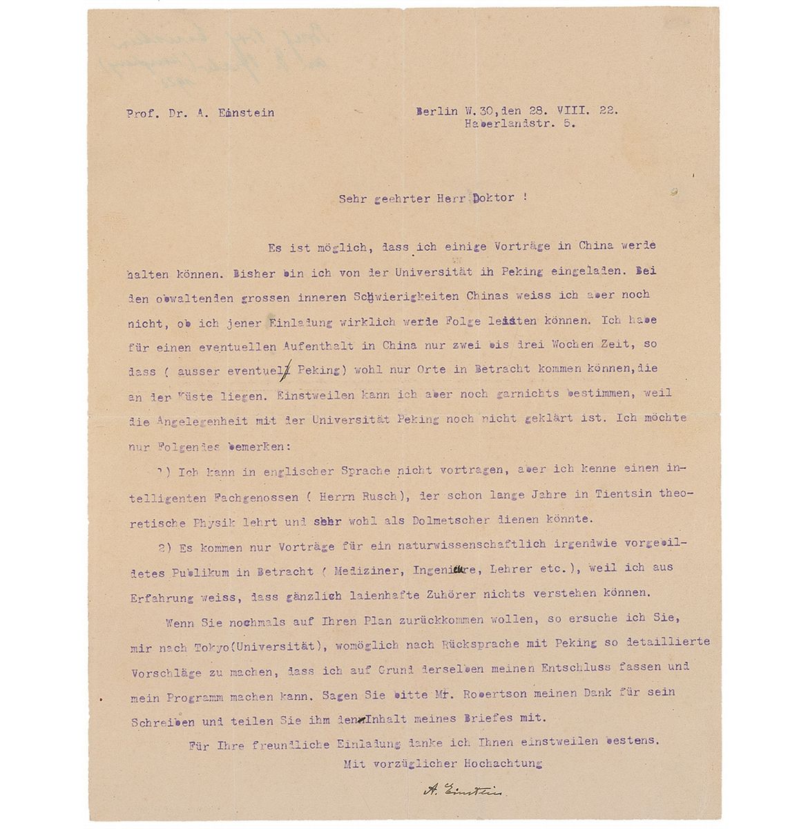 TLS in German, signed “A. Einstein,” one page, 8.75 x 11.25, August 28, 1922. Letter to an unidentified doctor. In full (translated): “It is possible that I will be able to deliver some lectures in China. At the present time I have been invited by the University of Peking. But because of the current political difficulties in China I am not sure whether I can really accept that invitation. I have only two or three weeks to spare for the eventual visit to China and (except for possibly Peking) I think the only cities situated on the coast of China can be taken into consideration. In the meantime I cannot decide anything as long as the matter with Peking University is not resolved. I would only like to mention the following: