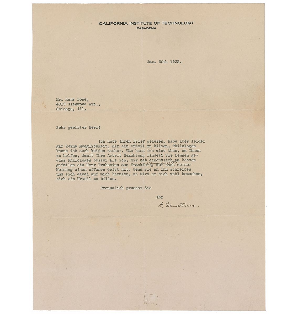 TLS in German, signed “A. Einstein,” one page, 8.25 x 11, California Institute of Technology letterhead, January 30, 1933. Letter to Hans Dose in Chicago. In full (translated): “I have read your letter but unfortunately I am in no position to make a judgment. There are no philologists I am close to. What can I do then to help you to keep your work on the agenda? You probably know better certain philologists than I do. The one I like most is a gentleman called Frobenius from Frankfurt [with "University" added in his own hand], who, in my opinion, is open-minded. Use my name when you write to him, and he will probably seek to make a judgment.” In fine condition, with intersecting folds, and a small spot of adhesive remnant to bottom edge. At the time of this letter, Einstein was in the midst of his third visiting professorship at the California Institute of Technology, where he made his final decision to not return to Germany, as the Nazi party was growing in power under Adolf Hitler. He would formally renounce his citizenship in March of the same year. Referring Dose to renowned German archeaologist and ethnologist Leo Frobenius, a professor at the University of Frankfurt and a major figure in the academic realm, this is an excellent letter connecting two star intellectuals.