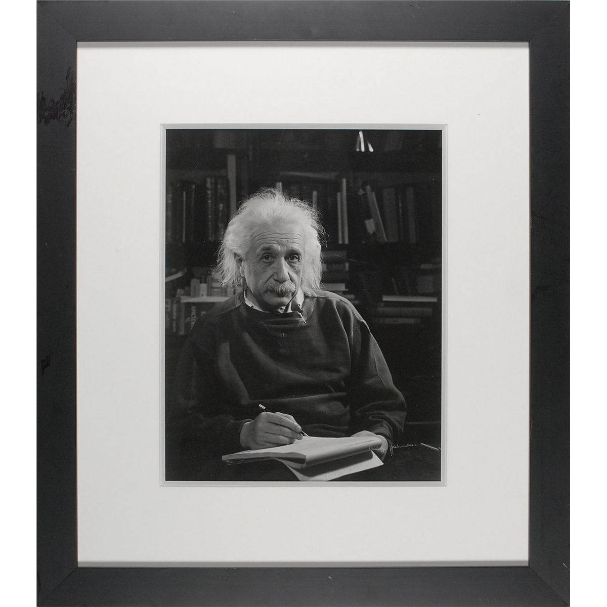 Exquisite limited edition artist’s proof semi-glossy 10.5 x 13.5 gelatin silver photo of Einstein seated and writing on a notepad, originally taken by Philippe Halsman during a 1947 sitting, bearing his blindstamp in the lower right. Reverse bears an ink stamp reading: “Copyright © Philippe Halsman All Rights Reserved 1978 This photograph is of exhibition quality having been produced according to the highest archival standards. It has been printed by a master printer under Philippe Halsman's control and approval in a strictly limited edition. Limited Edition # A. P.” Expertly matted and framed with a window on the reverse for viewing of the Halsman stamp to an overall size of 20 x 23. In fine condition, with an insignificant flaw to the right of Einstein’s face. Halsman’s defining images of Einstein are some of his most recognizable, with another from this sitting being used for a postage stamp and the cover of Time magazine. A superlative, exhibition quality image of Einstein as he is best remembered—a wild-haired academic jotting down notes in his study.