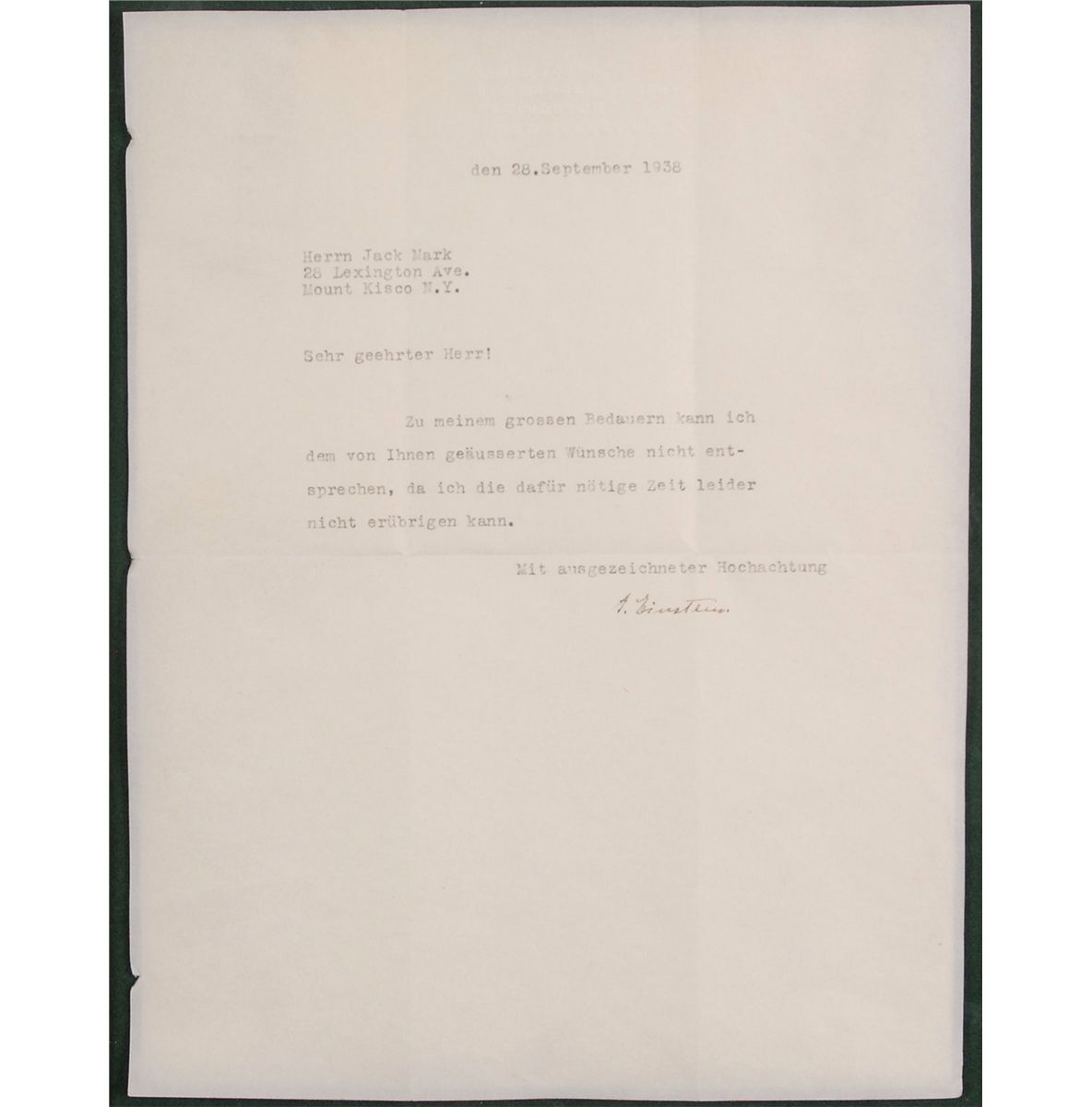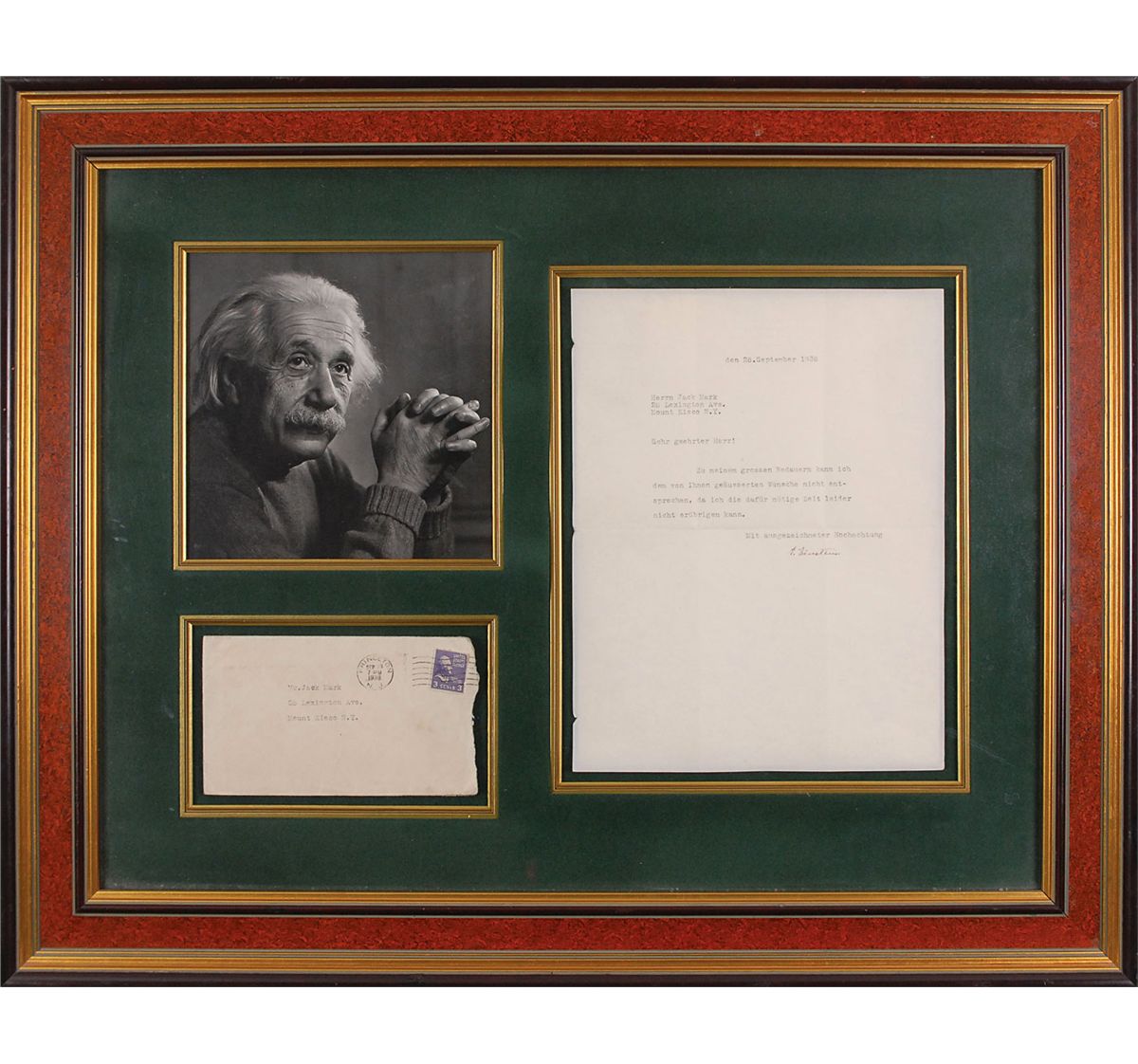 TLS in German, signed “A. Einstein,” one page, 8.25 x 1, blind-stamped personal letterhead, September 28, 1938. Letter to Jack Mark in Mount Kisco, New York. In full (translated): “Dear Lord! To my great regret, I can not comply with your expressed wishes, as I unfortunately can not spare the time necessary for it.” Nicely suede-matted and framed with the original mailing envelope and a portrait of Einstein to an overall size of 25.25 x 20.5. In fine condition, with intersecting folds, one through a single letter of signature, and three small dings to left edge. Oversized.