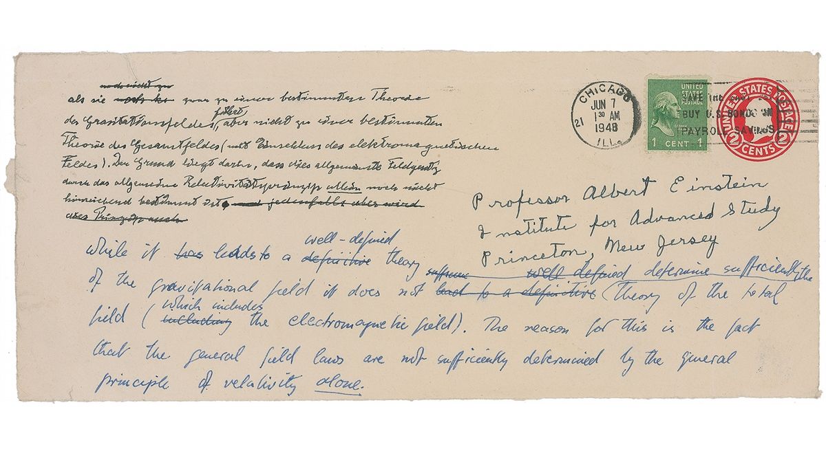 Important autograph manuscript draft in German, one page on the 10 x 4.5 address panel of an envelope sent to Einstein, postmarked June 7, 1948. Einstein drafts most of the final paragraph of his article entitled ‘Relativity: Essence of the Theory of Relativity,’ published in the American People's Encyclopedia. The paragraph is translated at the bottom in another hand, in full: “While it leads to a well-defined theory of the gravitational field it does not determine sufficiently the theory of the total field (which includes the electromagnetic field). The reason for this is the fact that the general field laws are not sufficiently determined by the general principle of relativity alone.” Einstein also edited the paragraph, making a few additions and deletions. In fine condition, with light scattered creases. ‘Relativity: Essence of the Theory of Relativity' became a well-known essay, and is cited in books such as The Einstein Reader, The Einstein Myth and the Ives Papers, and A Stubbornly Persistent Illusion, an anthology compiled by Stephen Hawking. This magnificent piece explains some of the problems in Einstein’s attempts to unify the general theory of relativity with electromagnetism, a subject that remains unsolved and is still studied today.