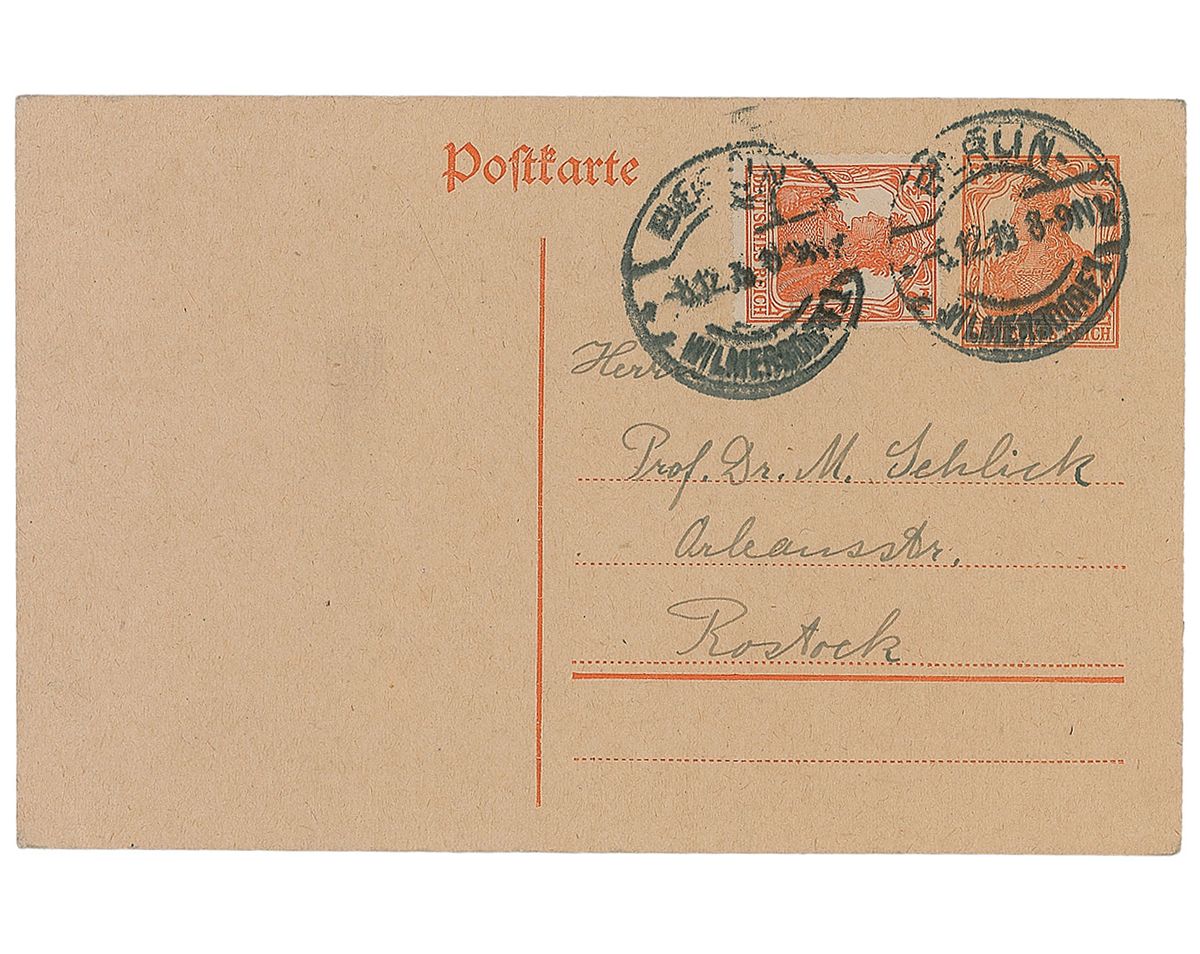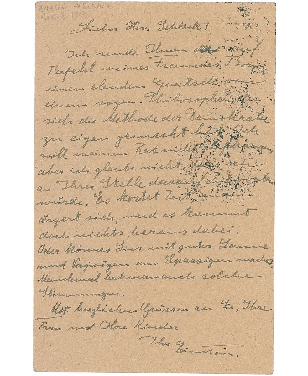 LS in German, signed “Einstein,” one page on a 3.5 x 5.5 postcard, December 8, 1919. Early letter to important philosopher and fellow physicist Moritz Schlick, sending along an article by Robert Drill. In part (translated): “On instructions by my friend [Max] Born I am sending you some shoddy rubbish by a supposed philosopher who has adopted the democratic method. I don’t want to force my opinion on you, but I do not think that if I were in your position I would respond to it. It takes away time, one gets irritated, and nothing is gained by it after all. Or can you approach it from the bright side and enjoy making fun of it? Occasionally one is in the mood for that too.” Show-through to upper right from postmarks to the opposing side (all writing remains legible), otherwise fine condition.