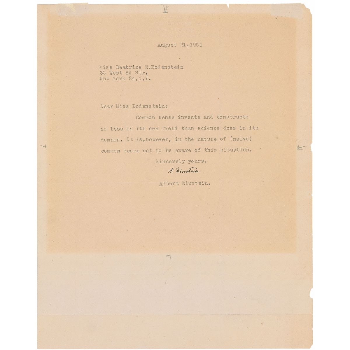 TLS signed “A. Einstein,” one page, 8.5 x 10.5, blindstamped Princeton letterhead, September 21, 1951. Einstein sends one of his now-famous and often quoted aphorisms, in full: “Common sense invents and constructs no less in its own field than science does in its domain. It is, however, in the nature of (naive) scientists common sense not to be aware of this situation.” Intersecting folds, chipping and small tears to edges, show-through from mounting remnants at the top, and a block of toning from previous display, otherwise fine condition. A thought-provoking and quintessentially Einsteinian letter in the pithy style he used with children and students, demonstrating an under appreciated aspect of his genius—the ability to simplify the complex.