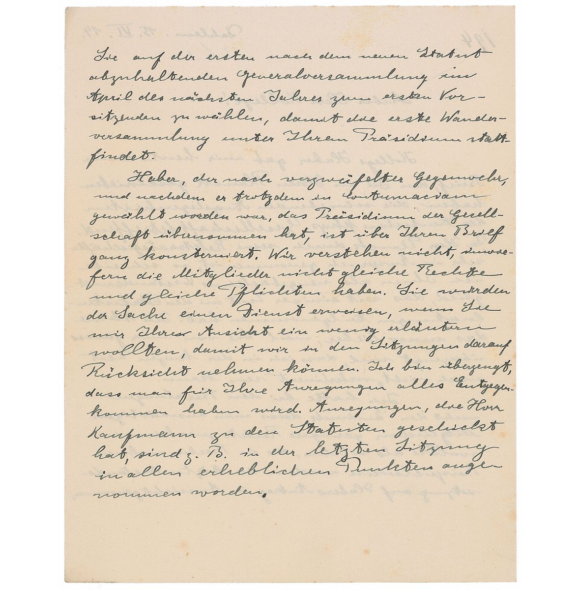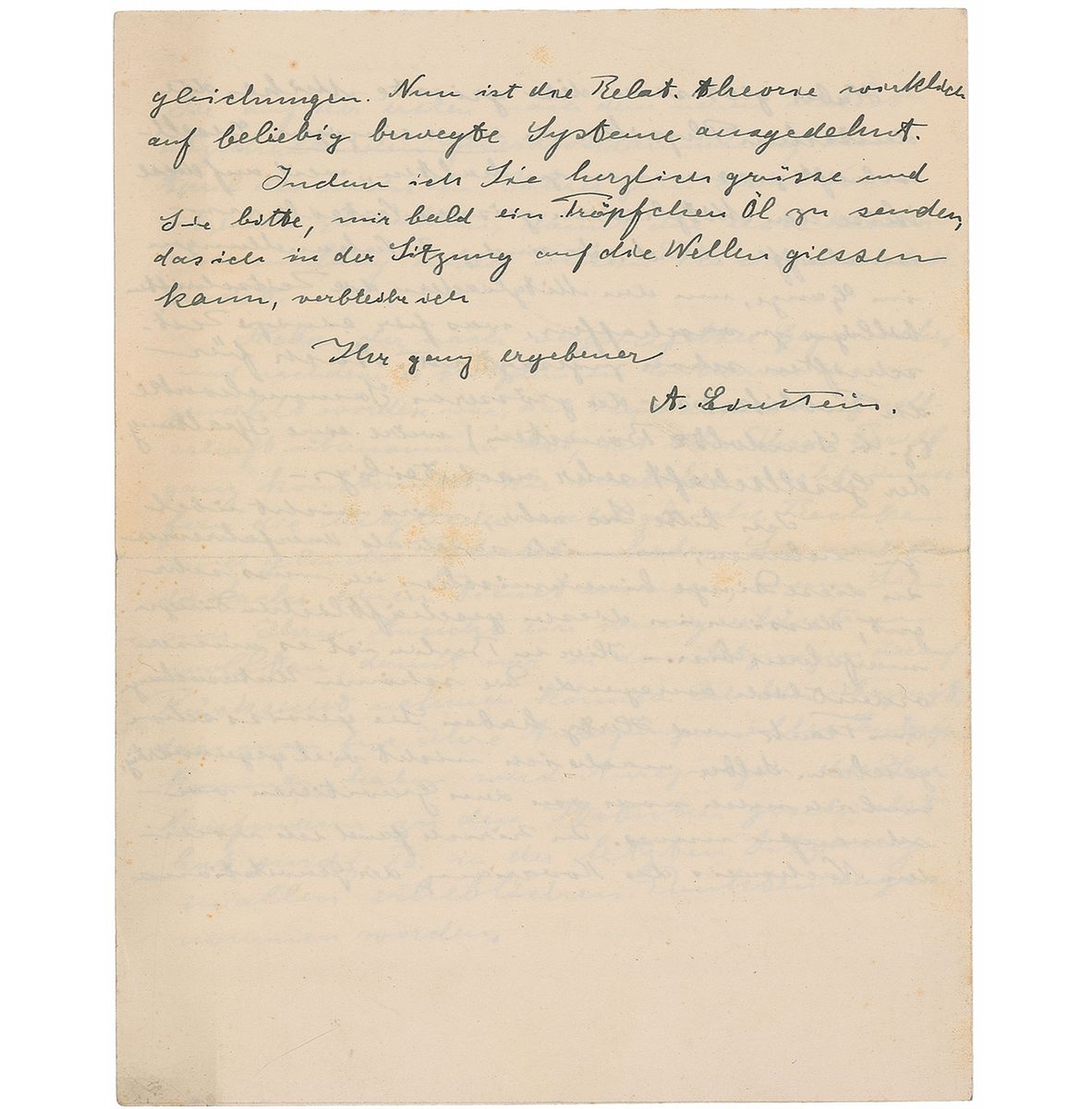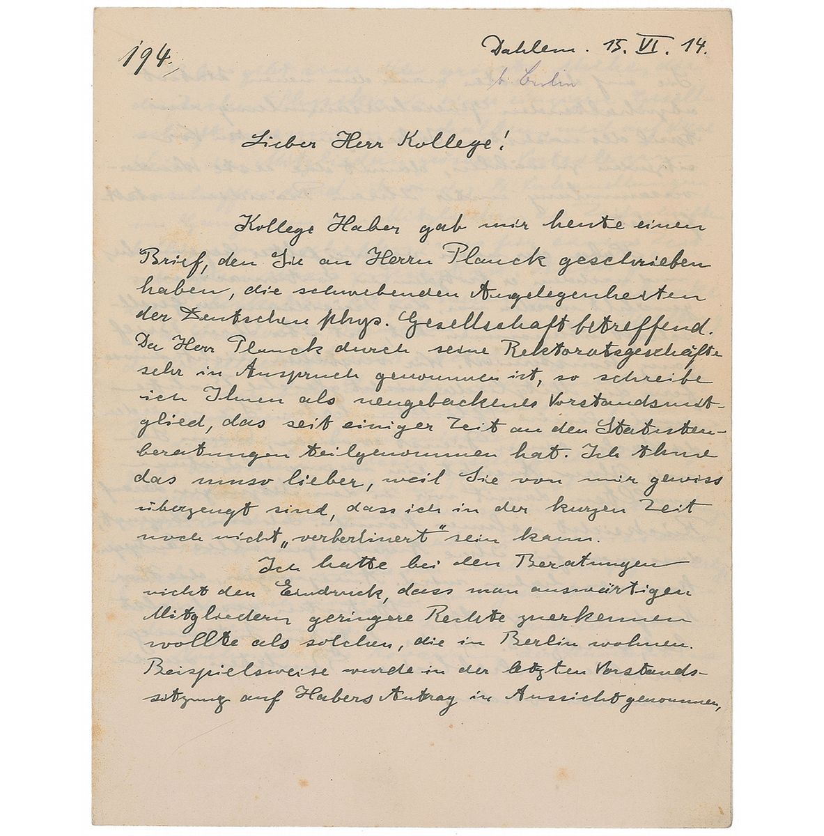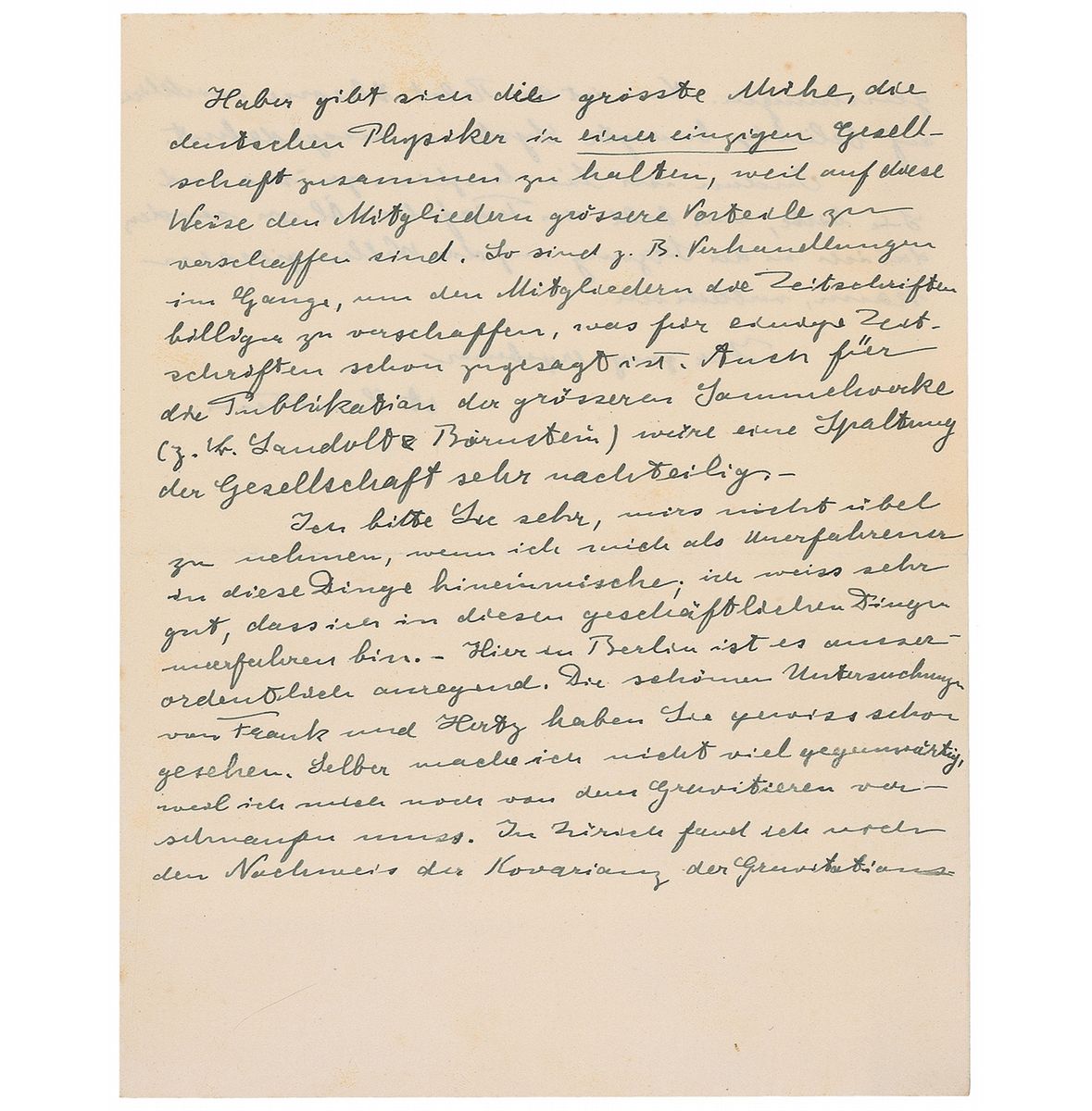 Historically important ALS in German, signed “A. Einstein,” four pages on two adjoining sheets, 6.5 x 8.25, June 15, 1914. Letter to his colleague, Nobel Prize–winning physicist Wilhelm Wien. In part (translated): “Haber gave me a letter today that you had written to Mr. Planck regarding the pending affairs of the German Phys. Society…I do not have the impression during the consultations that there was an inclination to grant fewer rights to corresponding than to those residing in Berlin…Haber is exerting his best efforts to hold German physicists together within a single society, because in this way greater benefits can be obtained for the members…I ask you please not to take offense at my novice meddling in these matters; I know very well that I am inexperienced in these administrative affairs.—It is extraordinarily inspiring here in Berlin. You have certainly already seen the fine analyses by Franck and Hertz. I am not doing much myself at the moment, because I must have a breather from gravitating. In Zurich I had found the proof for covariance in the gravitation equations. Now the theory of relat. really is extended to arbitrary moving systems.” In fine condition, with very subtle foxing. Accompanied by Wien’s retained copy of his response.