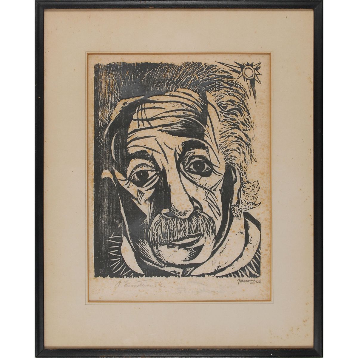 Striking woodcut print depicting Einstein made by Antonio Frasconi in 1952 for the Princeton Print Club, 10 x 14, signed in the lower border in pencil by the subject, “A. Einstein 52,” as well as the artist, “Frasconi 52.” Presented in its original mat and frame to an overall size of 16 x 20, with a label on the reverse describing the woodcut. In very good condition, with heavy overall foxing. Each year the Princeton Print Club commissioned a print of the campus that could be purchased by its members; in 1952 they chose a new subject, the university’s most eminent professor, Albert Einstein. Fleeing Nazi Germany, Einstein had taken a position at Princeton in 1933, and his affiliation with the Princeton Institute for Advanced Study continued until his death in 1955. A rare piece with an appealing connection to the physicist’s American home.