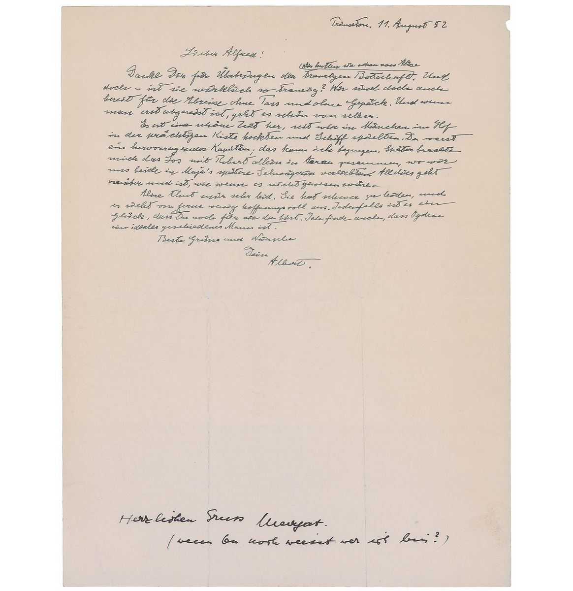 ALS in German, signed “Albert,” one page, 8.5 x 11, August 11, 1952. Letter to his cousin Alfred. In full (translated): "Thank you for relaying the sad news, we had already heard it from Alice. Even though, is it really so sad? We too are ready for departure without passports and without any luggage. And once departed, everything will fall into place all by itself. Much time has gone by since we were squatting in that marvelous crate at the Munich courtyard and played ship. You were a splendid captain, I can vouch to that. Later on, fate led me to cross my path again in Arau with Robert and we both fell in love with Maja’s future sister-in-law. All of that is over and done with, seems as if it never had happened. I am feeling very sorry for Alice. She is suffering greatly and from afar her condition does not look very promising. At any rate it is fortunate that you are still there for her. I suppose too that Ogden is the personification of the ideal divorced gentleman.” Also bears a two-line postscript written by “Margaret” at the bottom of the page: “Cordial greetings! (Do you still remember who I am?).” In fine condition, with intersecting folds and a trivial chip to one edge.
