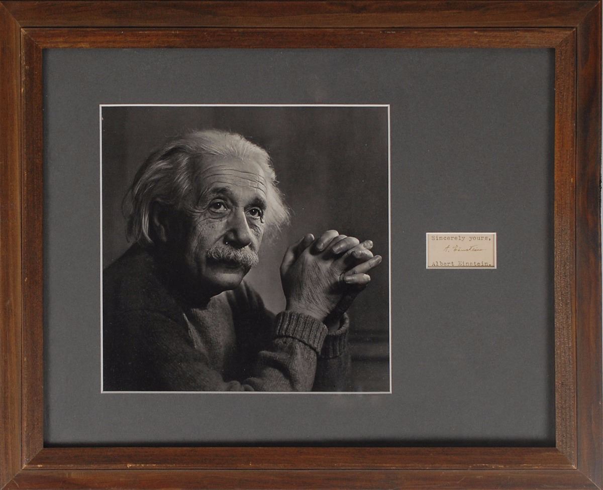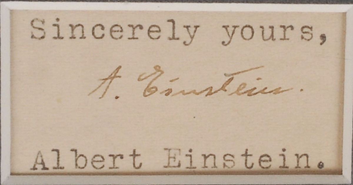 Ink signature, “A. Einstein,” on an off-white 1.75 x .75 slip clipped from the close of a letter. Matted and framed with a portrait of Einstein to an overall size of 16.5 x 13.25. In fine condition.