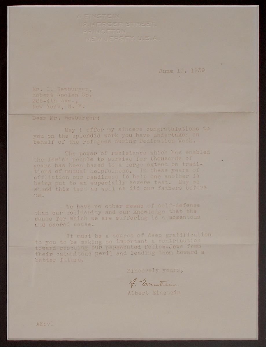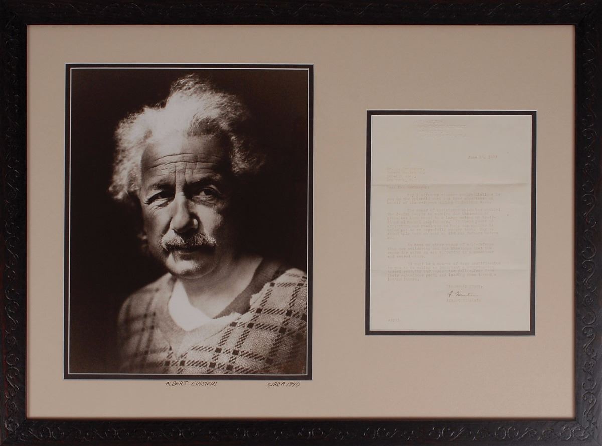 TLS signed “A. Einstein,” one page, 7 x 9.25, personal embossed letterhead, June 10, 1939. Letter to Mr. I. Newburger at Robert Woolen Co., in full: “May I offer my sincere congratulations to you on the splendid work you have undertaken on behalf of the refugees during Dedication Week. The power of resistance which has enabled the Jewish people to survive for thousands of years has been based to a large extent on traditions of mutual helpfulness. In these years of affliction our readiness to help one another is being put to an especially severe test. May we stand this test as well as did our fathers before us. We have no other means of self-defense than our solidarity and our knowledge that the cause for which we are suffering is a momentous and sacred cause. It must be a source of deep gratification to you to be making so important a contribution toward rescuing our persecuted fellow-Jews from their calamitous peril and leading them toward a better future.” Handsomely double-matted and framed with a large satin-finish photo of Einstein to an overall size of 26.5 x 19.75, with collector’s ink notations below the photo. In fine condition, with text and signature a shade light.