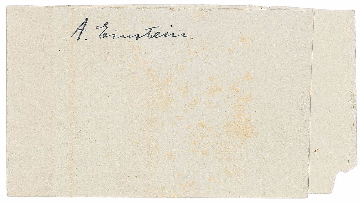 Crisp ink signature, “A. Einstein,” on an off-white 4 x 2.5 folded slip. In fine condition, with a vertical fold to right of signature, and faint overall foxing.