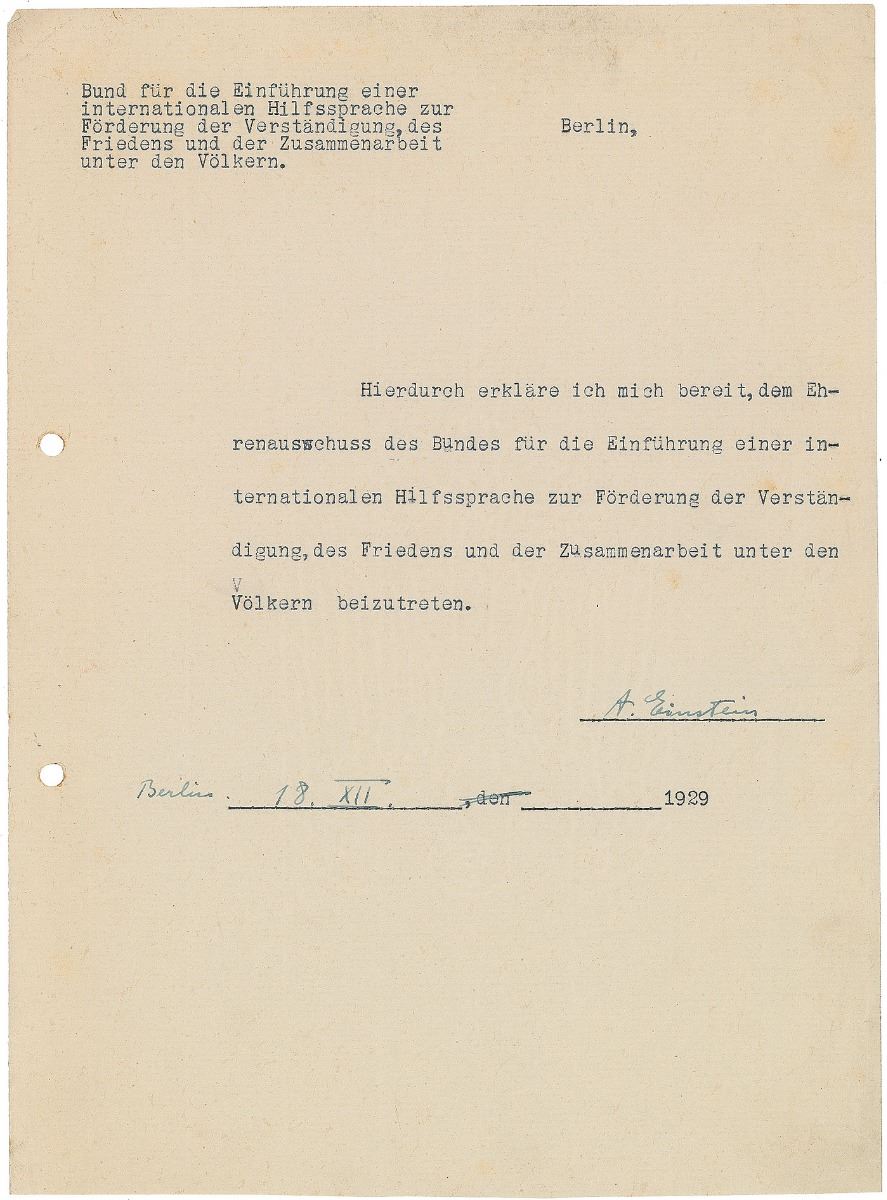 Wonderful DS in German, signed “A. Einstein,” one page, 8.25 x 11.25, December 18, 1929. Document headed (translated) “Federation for the introduction of an international auxiliary language to promote understanding, peace and cooperation among peoples.” In full: “I am willing to join the federation for the introduction of an international auxiliary language to promote understanding, peace, and cooperation among nations.” Signed and dated at the conclusion by Einstein, who adds the location, “Berlin.” In fine condition, with light handling wear and two punch holes to left edge.