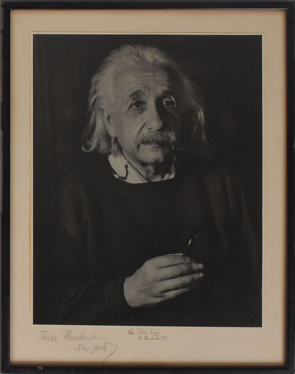 Phenomenal matte-finish 10.5 x 13 original silver gelatin photograph of Einstein in a serious yet amiable pose, affixed to its original 12.5 x 16.5 mount, signed and inscribed on the mount in fountain pen, “For Peter Foges, A. Einstein 52.” Also signed in pencil by the photographer, “Trude Fleischmann, New York.” Framed and in fine condition, with a small crease to the image and very light edge toning to the mount. Rare in this impressive size, this is a superb and poignant image of Einstein that perfectly captures his character.