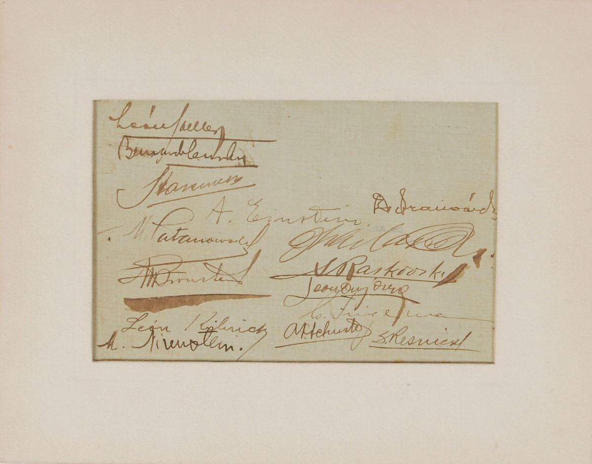Fantastic circa 1925 fountain pen signature, “A. Einstein,” on an off-white 4.75 x 3 album page, also signed by Argentine intellectuals Mauricio Nirenstein, Jorge Duclout, and several others. Matted to an overall size of 7 x 5.5. In fine condition.
