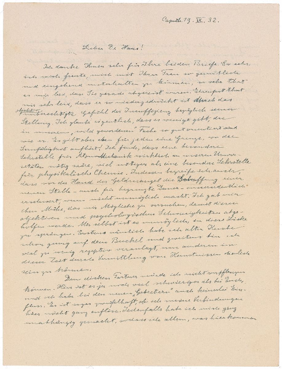ALS in German, signed "Einstein," one page both sides, 8.25 x 10.75, September 19, 1932. Letter to his longtime friend Wander Johannes de Haas, a German physicist and son-in-law of Hendrik Lorentz. In part (translated): "Ehrenfest makes me very sorry that he is so depressed through his feeling of insufficiency with regard to his post, which is objectively unjustified. I actually believe that there are few people who will be as well orientated as he will in our 'law of the jungle' department. Still, for everybody there is a limit where ability to learn comes to an end. I find that a special teaching post for atomic mechanics would be necessary in our universities; much more necessary than a teaching post for physical chemistry. Meanwhile, I also suppose that, for the present, the shortage of funds is making the creation of a new post, even for a limited duration, extraordinarily difficult, if not impossible. I even took the trouble to try what I could, so that these objective and psychological difficulties might be removed. It is impossible for me personally to jump into this gap. First, being an old boy, I already have enough on my back, and secondly I am much too little receptively skilled to be able to be serviceable to others at this time by the transmission of bits of knowledge.