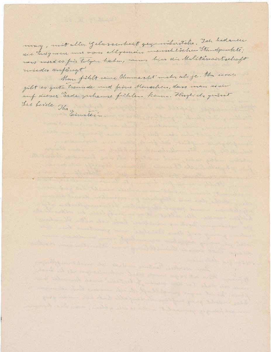 I would not be able to transplant the thick Partner. Here, it is yet more difficult than with you, and I also have no kind of influence with the new 'Governors.' It is even doubtful whether I do not altogether end my connections here. In any case, I have made myself quite independent, so that I may face anything that may come here with all composure. I regret the things that have happened to me from general human standpoints; what will there be as results, if the military economy starts again here! We feel our helplessness more than ever. Still, there are still good friends and fine people, so that we can feel at home on this earth." In fine condition, with central horizontal and vertical folds and a bit of trivial creasing. Accompanied by a full English translation.