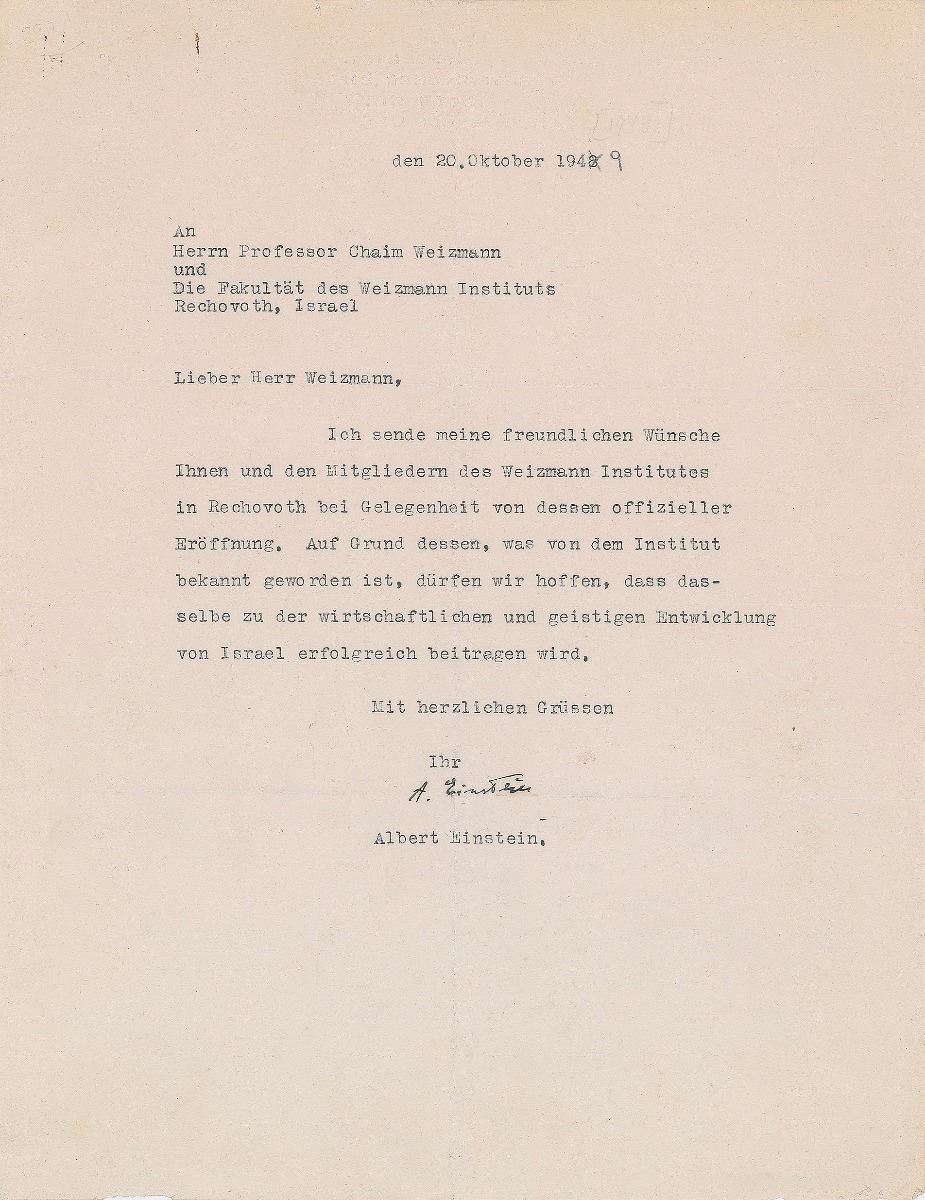 TLS in German, signed “A. Einstein,” one page, 8.5 x 11, blindstamped personal Princeton letterhead, October 20, 1949. Letter to Zionist leader Chaim Weizmann, in full (translated): "I send my kind wishes to you and the members of the Weizmann Institute in Rechovoth on the occasion of its official opening. On the basis of what is known by the Institute, we can hope that it will contribute successfully to the economic and intellectual development of Israel." In fine condition, with scattered light creasing and intersecting folds.