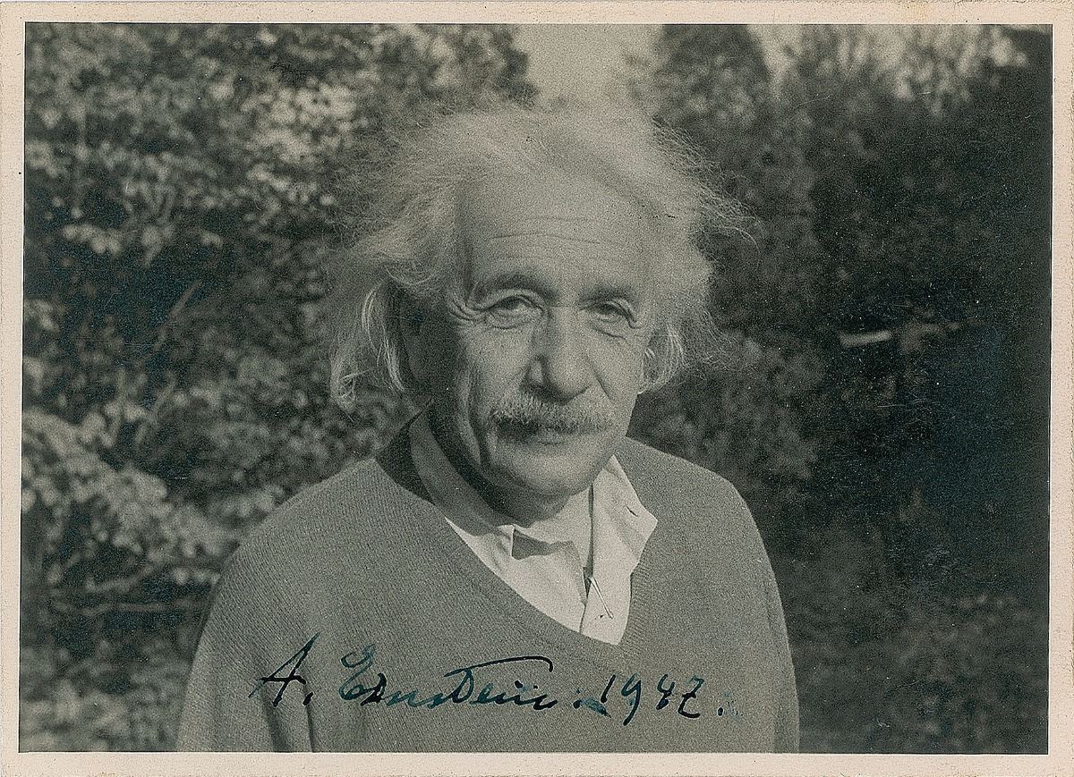 Crystal-clear vintage matte-finish 4.75 x 3.5 photo of Einstein, signed in fountain pen, "A. Einstein, 1942." Reverse bears an Abraham Mandelstam photographer's stamp. In fine condition, with light silvering to darker areas of the image. An exemplary image of the renowned physicist and humanitarian.