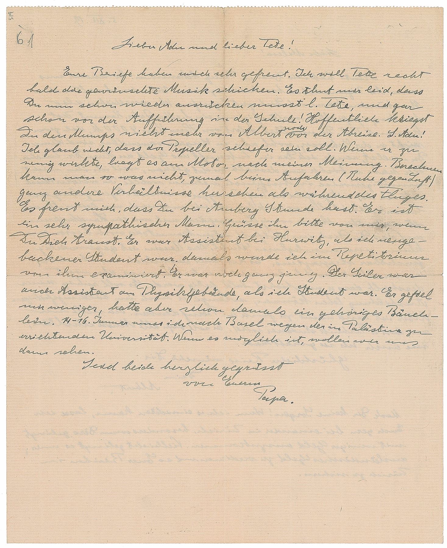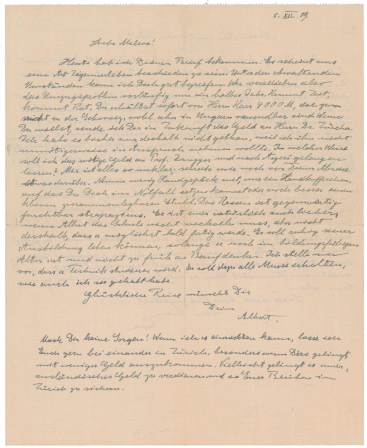 Remarkable ALS in German, signed “Albert” and “Papa,” one page both sides, 9 x 11, December 5, 1919. The front features a letter to his wife Mileva Maric, concerning their recent divorce and their children, in part (translated): “It seems that we are condemned to a kind of gypsy-life. Under the present circumstances I can understand you very well. So we will postpone, for the time being, the issue of moving house for half a year. Time will bring an answer. You will immediately receive 4000 DM from Mr. Karr…I also prefer, of course, that Albert will not have to change schools. Completing school as soon as possible is not a good enough reason. He should, by all means, get his education as long as he is still of an educable age and should not think of a profession too soon. I suppose that he will study a technical profession. He shall have all the time just as I did.” On the reverse he pens a letter, signed “Papa,” to his sons Hans Albert and Eduard about their education, his education, and ultimately, the education of the Jewish people in Palestine. He begins with a intriguing comments about a science a project his eldest son has undertaken: “I don't believe that the propeller should be more at a slant. If it does not have much effect it is, in my opinion, a problem with the engine. One cannot calculate something like that because during the start-up (rest versus air) the prevailing conditions are quite different from those in the course of flight.” He continues that he is "pleased that you are taking lessons from Amberg. He is a very sympathetic man...He was an assistant to Hurwitz when I was a fledgling student; at that time I was tested by him in the Repetitozimmer. He was then quite young. Seiler was also an assistant in the Physics building when I was a student. I liked him less.” At the end, he announces that he will be in Basel on January 14–16 “in connection with the planned university in Palestine.” In fine condition.