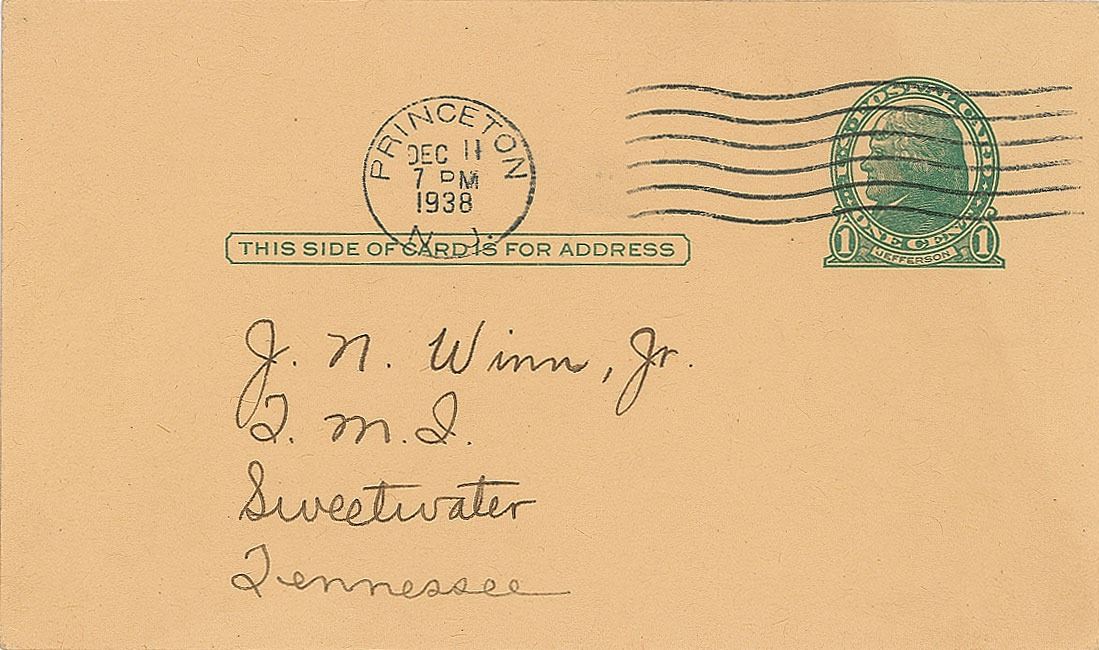 Fountain pen signature, "A. Einstein,” on an off-white 5.5 x 3.25 government postcard postmarked at Princeton, December 11, 1938. In fine condition.
