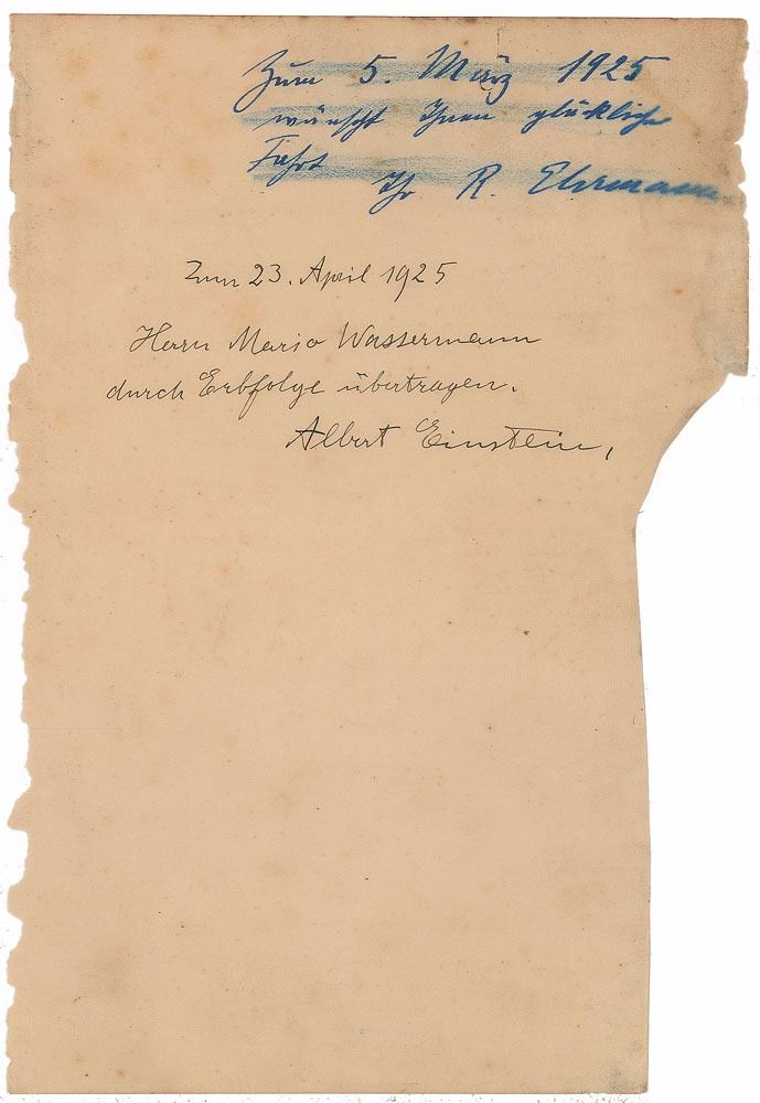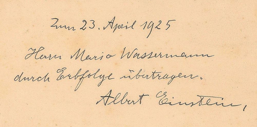 Vintage fountain pen signature and inscription in German, "23 April 1925, Hern Mario Wassermann, durch Erbfolge ubertragen, Albert Einstein,” on an off-white 6.25 x 9.25 sheet. An inscription in another hand is present at the top of the page. In very good to fine condition, with very slight foxing, and trimming and damage to the edges which could easily all be matted out (as shown in the illustration) to produce an excellent signature for display.