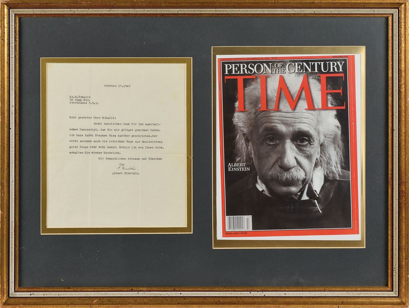 TLS in German, signed “A. Einstein,” one page, 8 x 9.25, blindstamped personal Princeton letterhead, October 17, 1946. Letter to Viennese-born synagogue music composer Heinrich Schalit, in part (translated): "Thank you for your gift of the musical manuscript. I have written to Rabbi Stephen Wise who will know all the ways to bring this good thing to realization." Matted and framed beside a copy of a Time Magazine cover honoring Einstein as 'Person of the Century' to an overall size of 23.5 x 17.5. In fine condition. Accompanied by a copy of the printed sheet music for Schalit's 'The 98th Psalm,' dedicated to Einstein at the top of the first page.