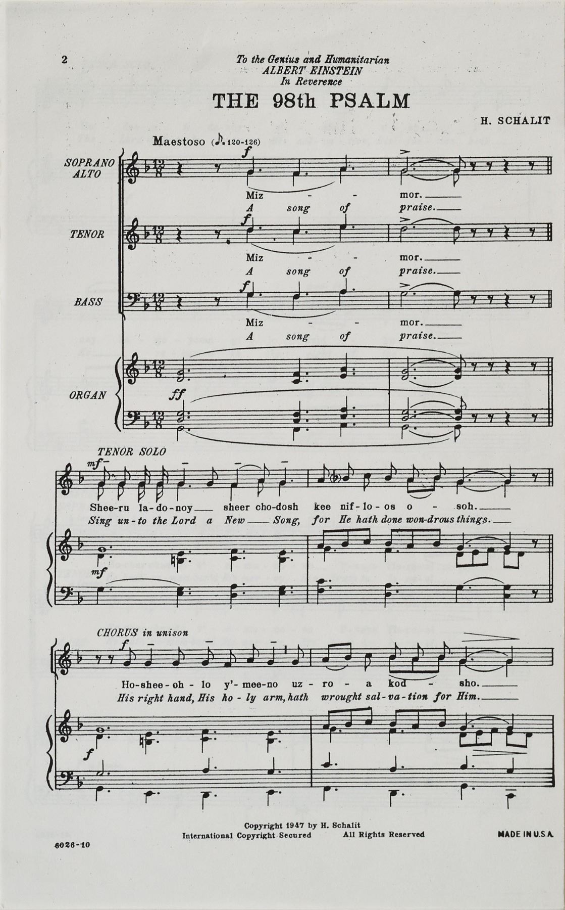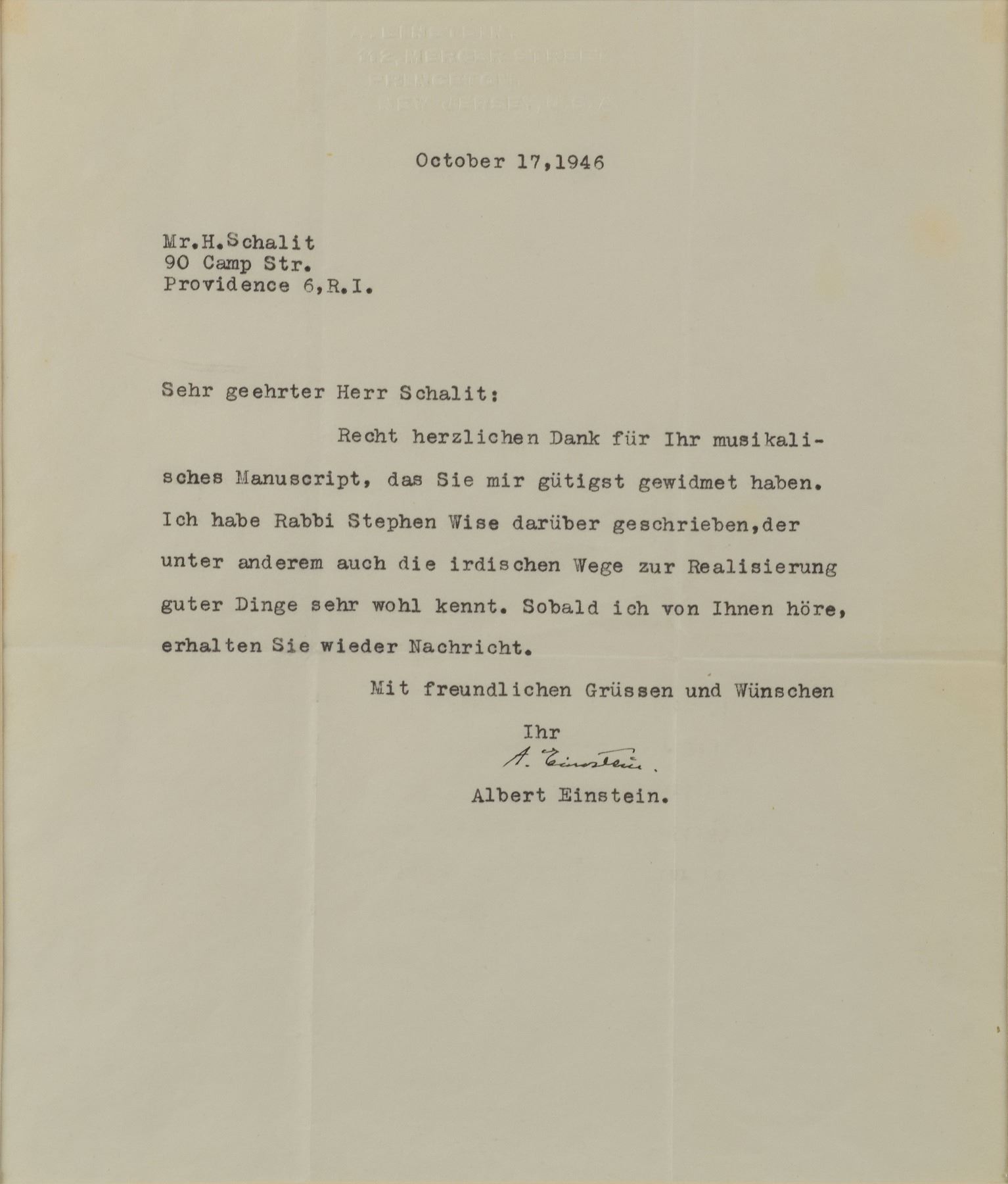 The musical manuscript that Einstein mentions, 'The 98th Psalm,' was dedicated by Schalit to 'The Genius and Humanitarian Albert Einstein.' Like Einstein, Schalit fled Europe during World War II and took refuge in America. In a great humanitarian effort throughout the 1930s and 1940s, Einstein lent his support to a multitude of Jewish scientists, intellectuals, and artists who fled the danger of Europe and resettled in the United States. In addition to his scientific and humanitarian accomplishments, Einstein was a noted lover of music and a talented violinist—he would have easily been able to interpret Schalit's musical manuscript. An exemplary, boldly signed letter connecting two Jewish leaders who fled the Holocaust.