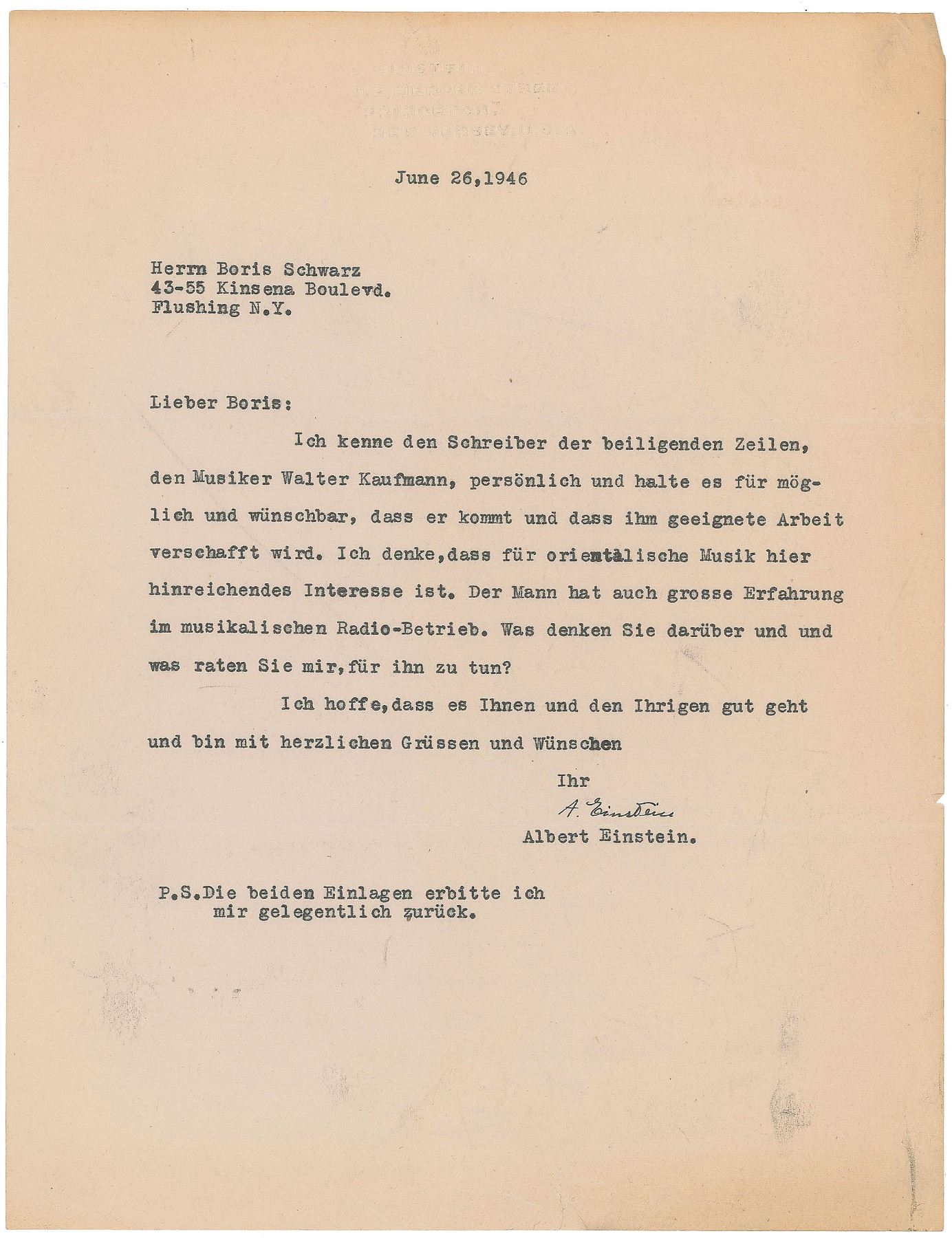 TLS in German, signed “A. Einstein,” one page, 8.5 x 11, blindstamped Princeton letterhead, June 26, 1946. Letter to violinist Boris Schwarz, a professor of music at Queens College in New York. In full (translated): "I know the writer of the enclosed lines, the musician Walter Kaufmann, personally and consider it possible and desirable that he should come and that suitable work be provided for him. I think there is enough interest in oriental music here. The man also has great experience in musical radio operation. What do you think about it and what do you advise me to do for him?" In fine condition, with light perimeter toning, and a short tear to the bottom edge. Kaufmann, a noted composer, conductor, and musicologist, was especially well-known for his study of Asian music. He decided to leave Europe in the 1930s because of his Jewish ancestry, and traveled throughout India studying their music. He was unable to return to his native Prague after the war, as his family's fortune had been confiscated. Instead, he emigrated to Canada; after living and teaching there for several years, he ultimately settled in the United States and became a naturalized citizen in 1964.