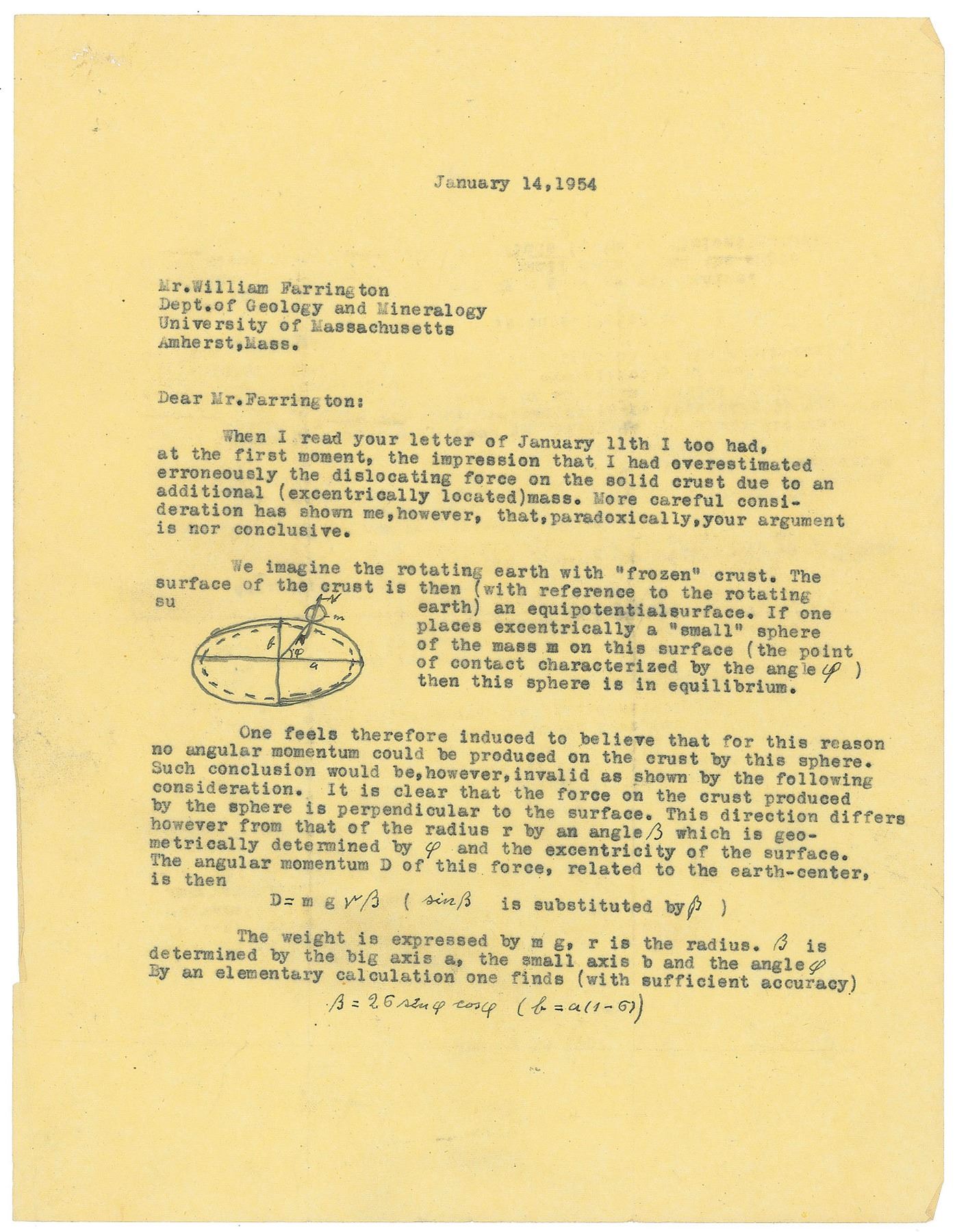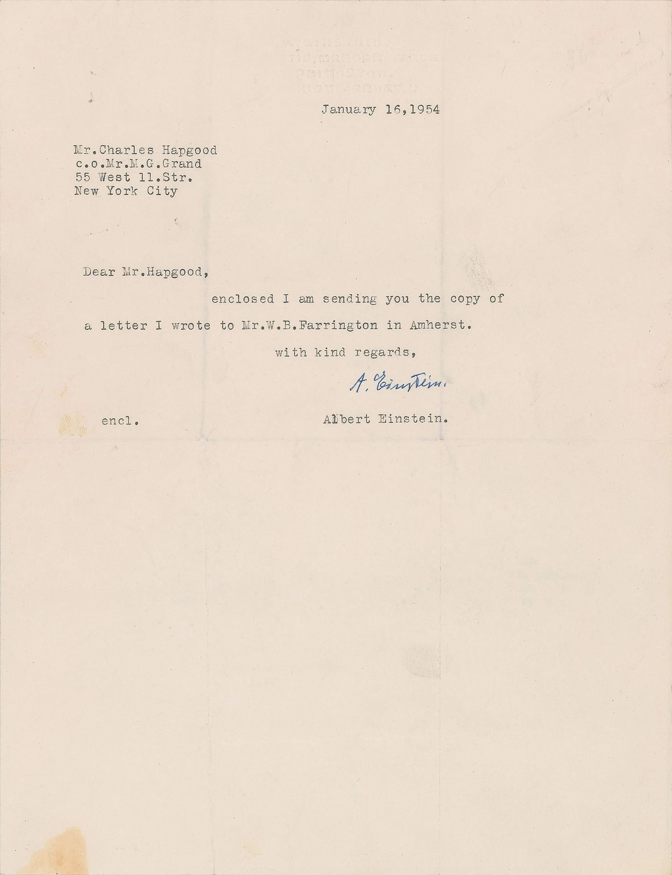 TLS signed “A. Einstein,” one page, 8.5 x 11, blindstamped Princeton letterhead, January 16, 1954. Letter to Mr. Charles Hapgood, enclosing a carbon copy of a letter he wrote to Mr. William Farrington, Dept. of Geology and Mineralogy at the University of Massachusetts, on Hapgood's theory of earth crust displacement. In full: "Enclosed I am sending you the copy of a letter I wrote to Mr. W. B. Farrington in Amherst." Includes the two-page carbon copy enclosure, an unsigned typed letter by Einstein which bears several handwritten annotations, including: an original hand-drawn diagram, three original handwritten equations, a term representing tangential force, and five original handwritten angles—three for "beta" and two for "phi," as well as one holograph word, all by Einstein.