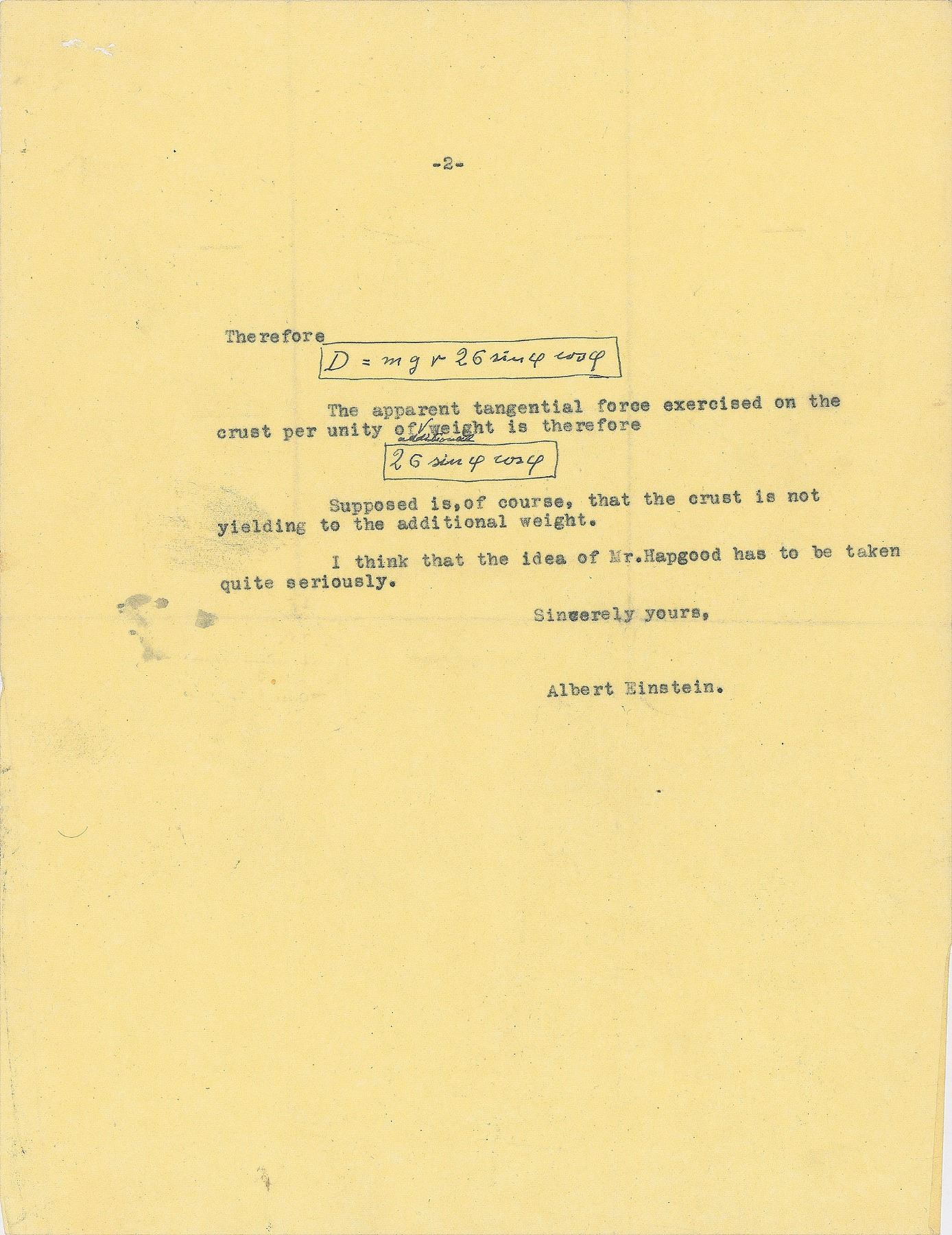 Einstein wrote the foreword to Hapgood's book, The Earth's Shifting Crust, published by Pantheon Books in 1958. Hapgood's book denied the existence of continental drift, speculating that the ice mass at one or both poles over-accumulates and destabilizes the Earth's rotational balance, causing slippage of all or much of Earth's outer crust around the Earth's core, which retains its axial orientation. A spectacular scientific letter by Einstein.
