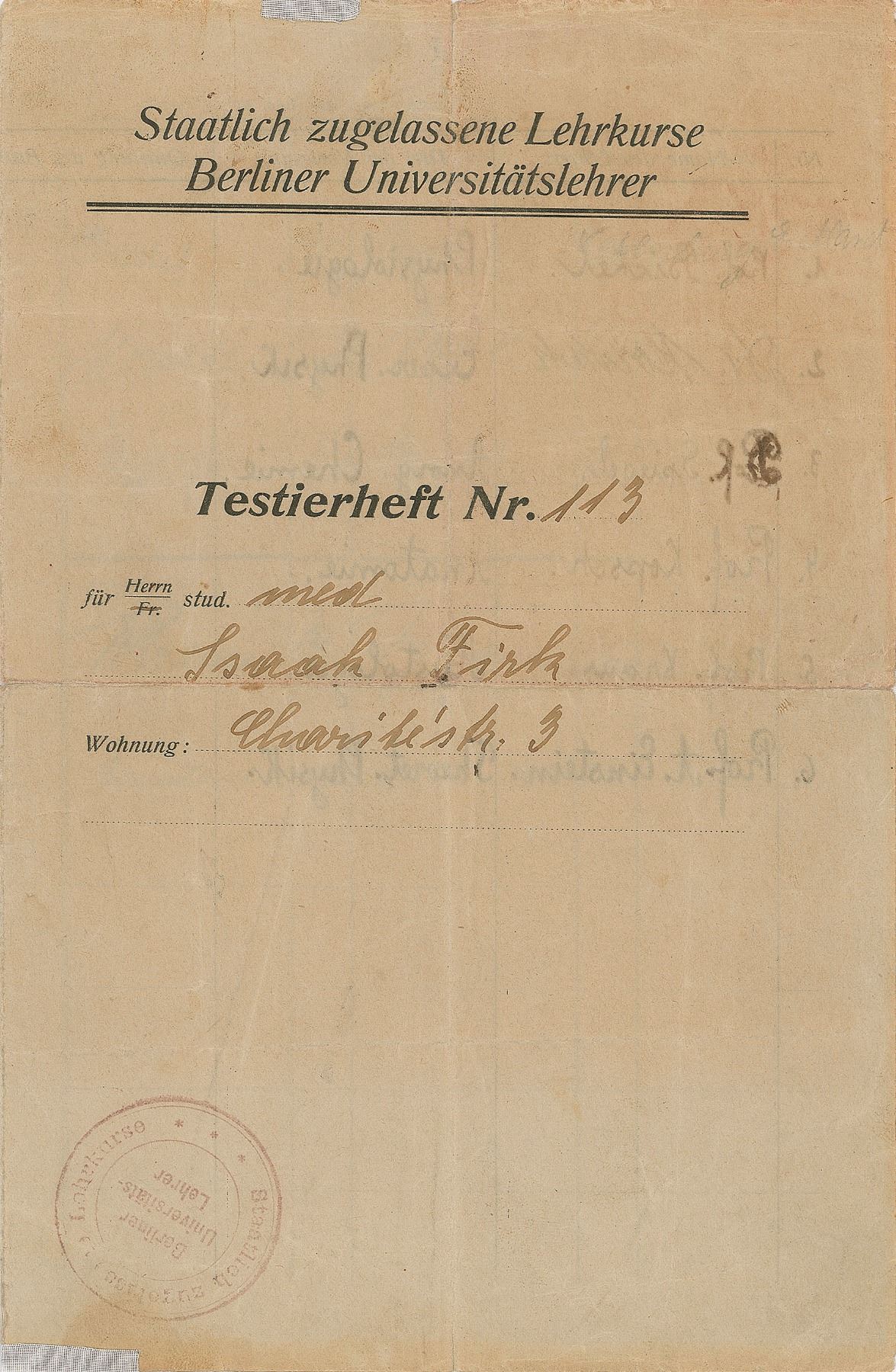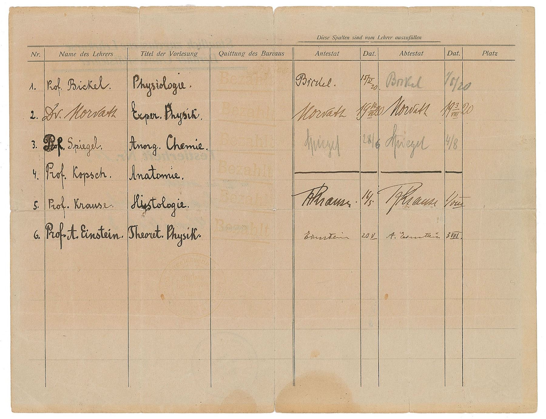Partly-printed DS, signed "Einstein" and "A. Einstein," one page, 11.5 x 8.75, May–August 1920. Official Berlin University transcript of Isaak Firk, a medical student, noting his attendance and payment at a series of lectures in physiology, experimental physics, inorganic chemistry, anatomy, histology, and theoretical physics. Einstein signs twice as professor of theoretical physics, adding dates of May and August 1920; also signed twice by four other professors. The document bears several official university stamps. In very good condition, with creasing, light staining, short splits along intersecting folds, and a few small remnants of mounting tape to edges.