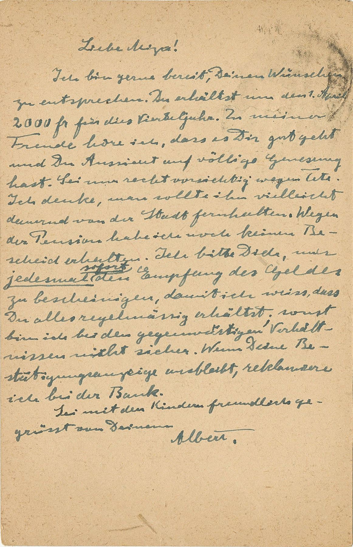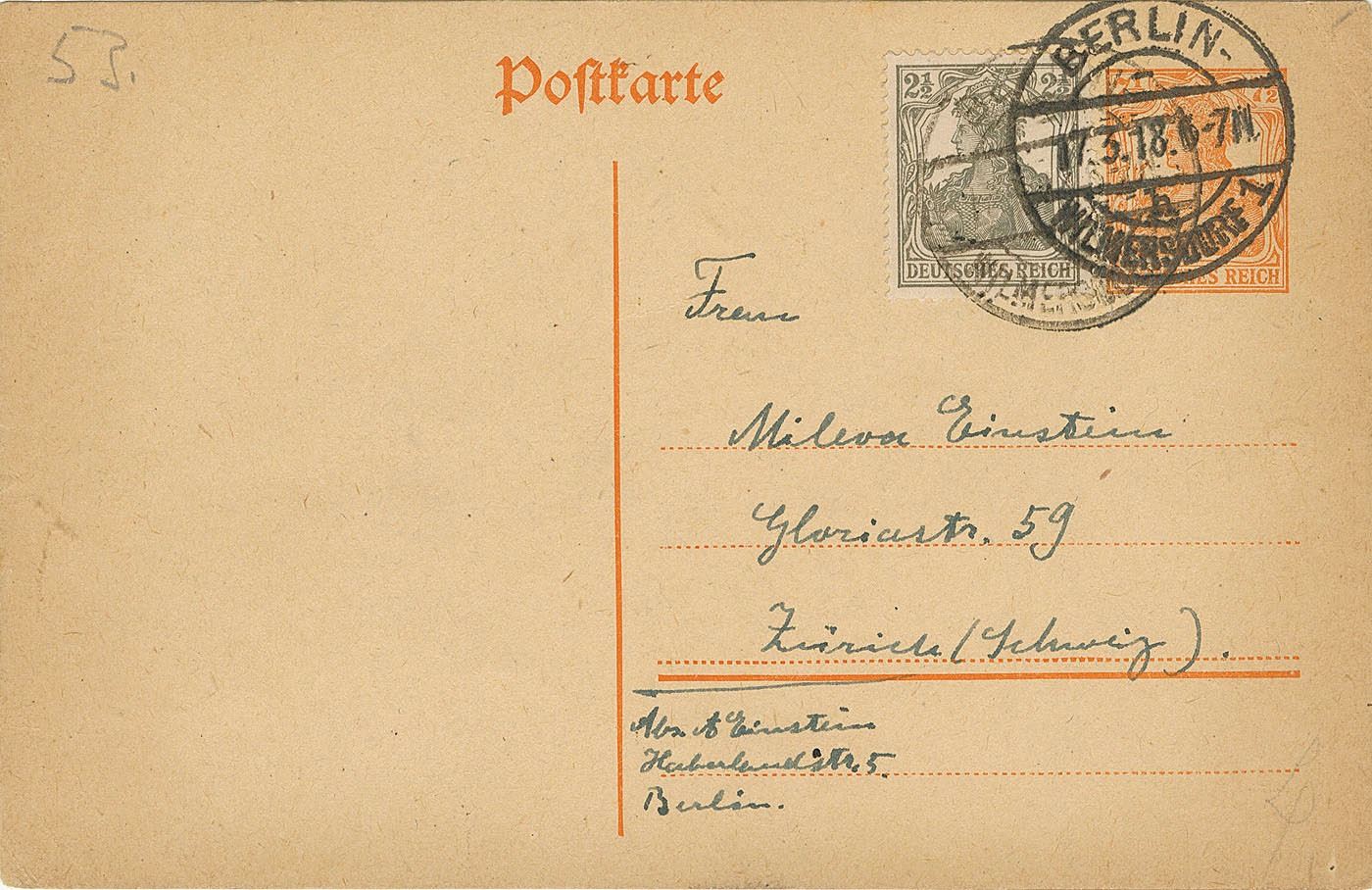Remarkable ALS in German, signed “Albert,” one page on a 3.5 x 5.5 postcard, postmarked March 17, 1918. An untranslated letter to his first wife, physicist and mathematician Mileva Einstein, written from Berlin. Addressed on the reverse in Einstein's hand to "Mileva Einstein," incorporating his full name, "Albert Einstein," into the return address. In fine condition.