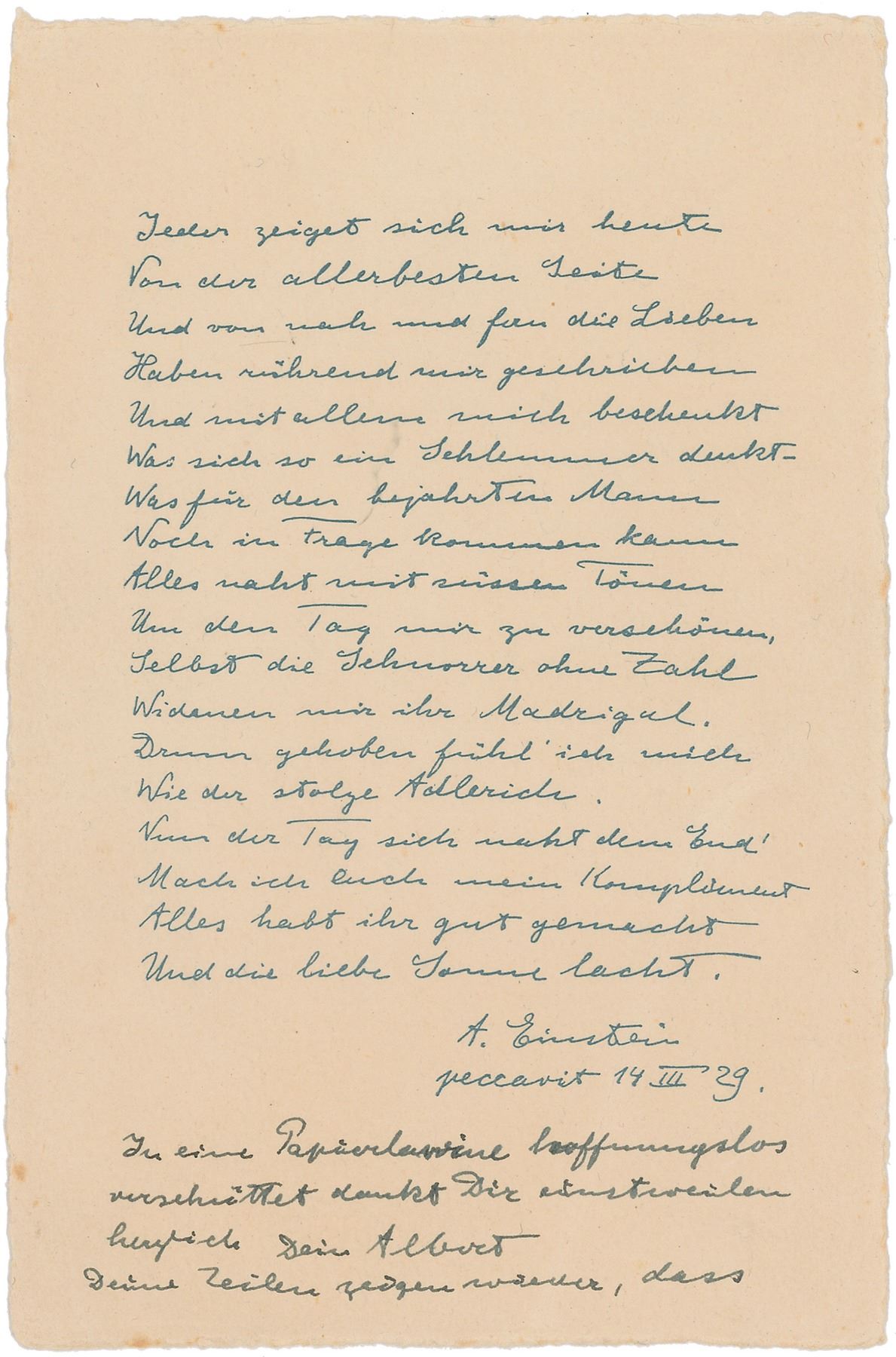 Third-person ANS in German, signed “Albert,” one page, 4.5 x 6.75, no date. Below a printed facsimile poem celebrating his fiftieth birthday (dated March 14, 1929), Einstein writes: "Hopelessly buried in an avalanche of papers, your Albert thanks you heartily for the time being. Your lines again show that nothing in later life is equal to the friendships of youth. The theory of electricity based on parallelism at a distance becomes ever more attractive. Whether it is true, however, I still don’t know. It will be revealed soon." In fine condition, with scattered creasing, and an unobtrusive diagonal fold passing through the signature.