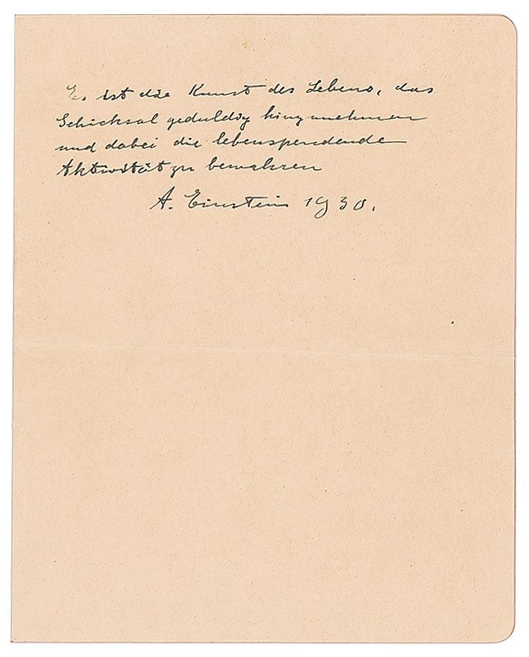 Remarkable and outstanding AQS in German, signed “A. Einstein,” one page, 5 x 6.25, 1930. Einstein pens a four-line quote on the 'Art of Life,' in full (translated): "It is the art of life to patiently accept fate while preserving the life-giving activity." In fine condition, with a central horizontal fold, well beneath all of the handwriting. Einstein's original bits of thinking are becoming less and less common, and this meaningful quote stands out as one that is full of wisdom. A truly superb and spectacular piece from the greatest mind of the 20th century.