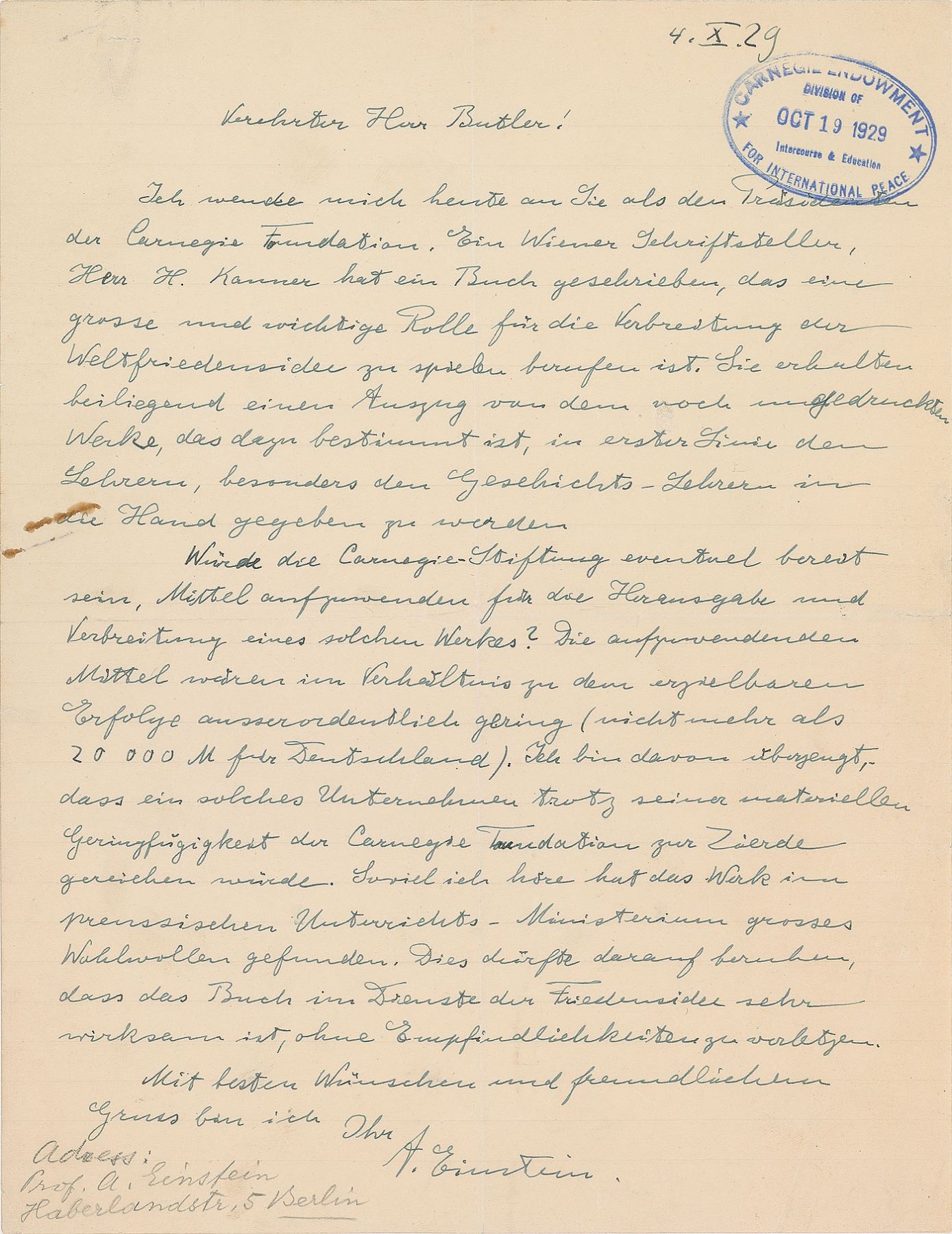 ALS in German, signed "A. Einstein," one page, 8.5 x 11, October 4, 1929. Letter to Nicholas Murray Butler, in part (translated): "I turn to you as Pres. of the Carnegie Foundation. A Viennese author H. Kanner has written a book which is destined to play an important role in the dissemination of the idea of world peace. Enclosed is an excerpt from the work…it is primarily intended for teachers of history. Would the Carnegie Foundation be prepared to provide funds for the publication and distribution of such a work? Compared to the potential for extraordinary success, the cost would be very slight (not more than 20,000 marks). I am convinced that such an undertaking, despite its moderate cost would do honor to the Carnegie Foundation…I've heard that the work has been very favorably received by the Prussian Ministry of Education. This must be because the book very effectively serves the idea of world peace, without offending sensibilities." In fine condition, with small staple holes to the upper left corner and a rusty paperclip impression to the left edge. Accompanied by the retained carbon copy of Butler's response. An especially notable letter as it comes from an early period in Einstein's humanitarian work and connects two Nobel Prize winners-Einstein won the 1921 Nobel Prize in Physics, and Butler received the Nobel Peace Prize in 1931.