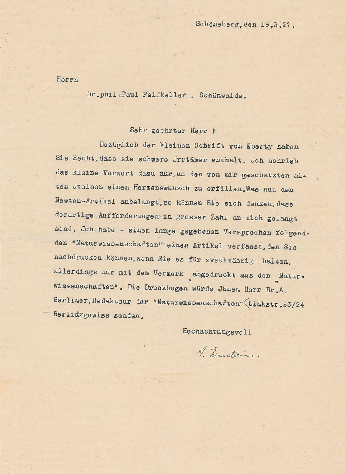 TLS in German, signed “A. Einstein,” one page, 8 x 11, March 19, 1927. Letter to German philosopher Paul Feldkeller, referring to his famous 1927 article on Isaac Newton published in the Naturwissenschaften, 'Newton's Mechanics and its Influence on the Formation of Theoretical Physics.' In part (translated): “As far as the Newton article is concerned, you can imagine that such requests have reached me in large numbers. I have - written a long-promised article for Naturwissenschaften that you can reprint, if you deem it appropriate, but only with the note ‘reprinted from Naturwissenschaften.’” In fine condition, with some light creasing and faint foxing.