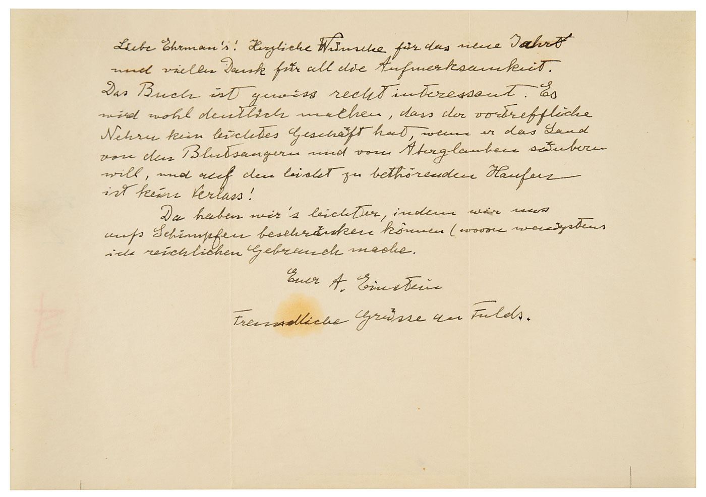 Fascinating ALS in German, signed “A. Einstein,” one page, 8.25 x 5.75, no date [January 1950]. Letter to Rudolf Ehrman, who had been his physician in Berlin and who emigrated to America before World War II; in Einstein’s final years, Ehrman once again served as one of his physicians. Although undated, research indicates that the letter was likely penned in January of 1950. In full (translated): “Best wishes for the New Year and many thanks for all the attention. The book is surely very interesting. It will make it ever clearer that the unequaled Nehru doesn’t have an easy job, to clean the country from bloodsuckers and superstition, when one cannot count on the support of the rabble. In this sense our lot is easier, as we can restrain ourselves by complaining (which I, at least, put to good use)." In very good to fine condition, with intersecting folds, a stain touching the sentiment, and light show-through from two notations on the reverse.