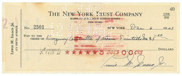 Endorsed bank check, 8 x 3, filled out in another hand and signed by by Lewis M. Isaccs, Jr., payable to the Emergency Committee of Atomic Scientists for $5.00, dated December 6, 1947, and endorsed on the reverse, “A. Einstein.” In very good condition, with several vertical creases, a bit of light skipping to signature, expected stamps and holes, small edge tear, and tape remnants along left edge. The Emergency Committee of Atomic Scientists was founded by Albert Einstein and Leó Szilárd in 1946. As a founding representative of the organization, it was no doubt incumbent upon Einstein to accept payment on behalf of the group. Pre-certified John Reznikoff/PSA/DNA and RRAuction COA.