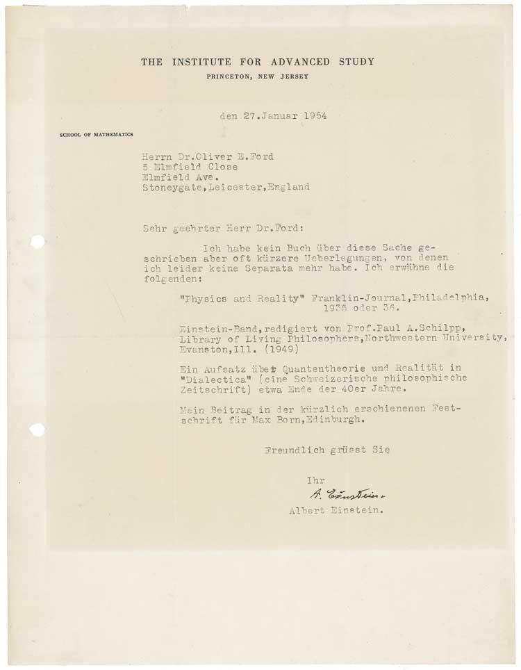 TLS in German, signed “A. Einstein,” one page, 8.5 x 11, Institute For Advanced Study letterhead, January 27, 1954. Letter to Dr. Oliver Ford in England. Einstein explains that while he has not written a book on physics, quantum theory, and reality, he has produced several shorter pieces, but has run out of off-prints. He therefore gives references for a few of his articles on the subject. In full: "I did not write a book on this subject, but did write numerous shorter reflections on it. Unfortunately, I no longer have any extra prints of these. In that connection, the following information should be helpful: 'Physics & Reality' Franklin Journal, Philadelphia, 1935 or '36 'Einstein - Volume,' edited by Prof. Paul A. Schilpp, Library of Living Philosophers, Northwestern University, Evanston, Ill. (1949) An essay on Quantum Theory and Reality in 'Dialectica' (a Swiss Philosophical Periodical) in an issue probably of the late Forties My contribution to the recently issued Max Born Commemorative Publication, Edinburgh.” Intersecting folds, one through a single letter of signature, punch holes to left side, light block of toning over text and signature from previous display, and a couple of tape repairs and tears to top edge, otherwise fine condition.