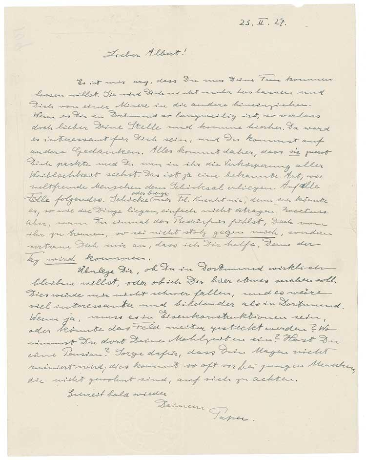 ALS in German, signed “Papa,” one page, 8.5 x 11, February 25, 1927. A bitter letter to his son Hans Albert, regarding his fiancée and later wife Frieda Knecht. In part (translated): “I am pained to hear that you now want to let your wife come. She will never let go of you and will draw you from one disaster to the next. If you find it so boring in Dortmund, why don’t you give up your position there and come here. It will be interesting and a change of pace for you. It all comes from her having seized you first, which is why you now view her as the embodiment of femininity. It is, after all, a common way for sillies to fall victim to fate. In any case: never send or bring Miss Knecht to me, for the way things are, I simply could not bear it. If, however, you ever feel the urge to separate from her, then do not be proud, but confide in me, so that I may help you. For that day will come. Think about whether you really want to stay in Dortmund, or whether I should look for something for you here. That would not be difficult for me; and it would be much more interesting and educating than in Dortmund. If so, must it be in steel engineering, or would a wider field do as well? Where do you take your meals? Are you staying at a boarding house? Be careful not to ruin your stomach, this is so often the case with young persons who are unaccustomed to taking care of themselves.” In fine condition, with intersecting mailing folds, and a couple of trivial edge dings.